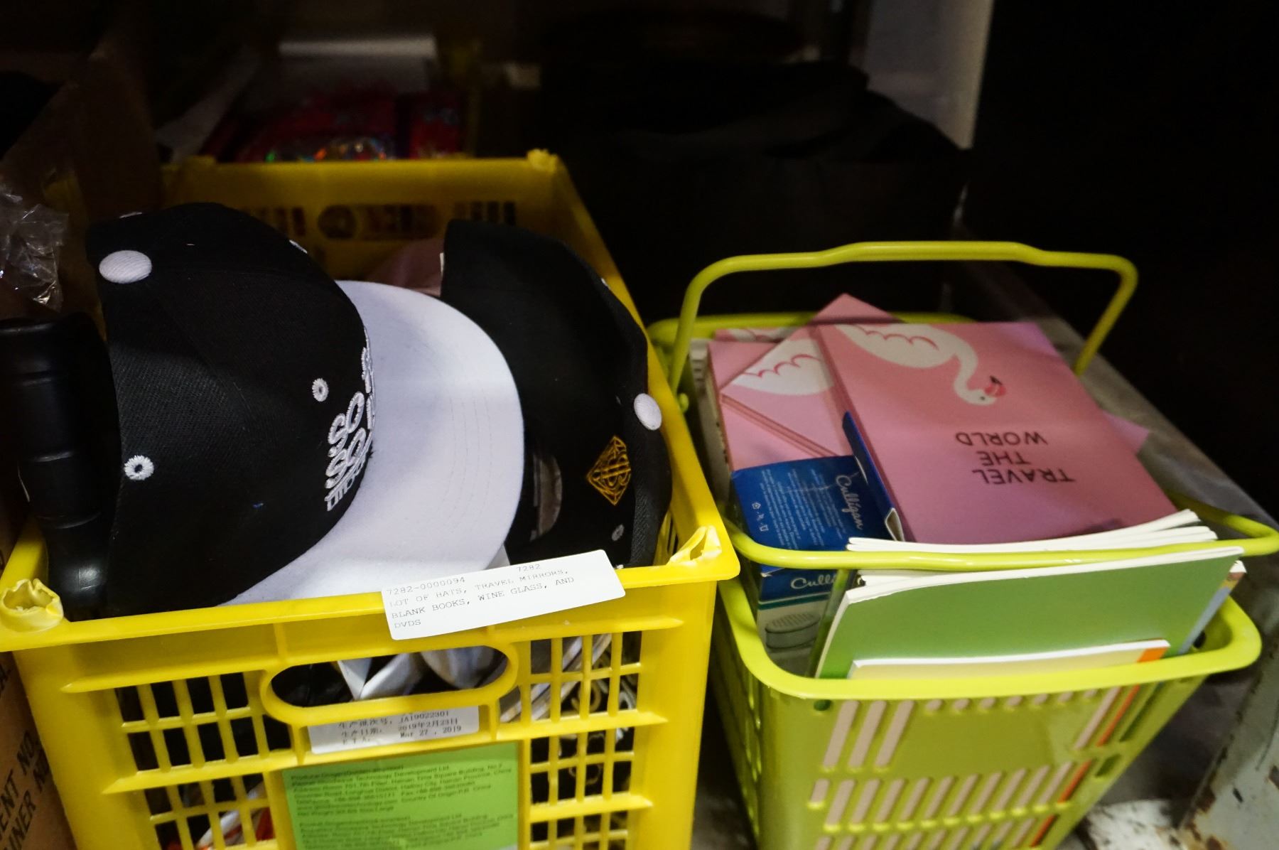 LOT OF HATS, TRAVEL MIRRORS, BLANK BOOKS, WINE GLASS, AND DVDS