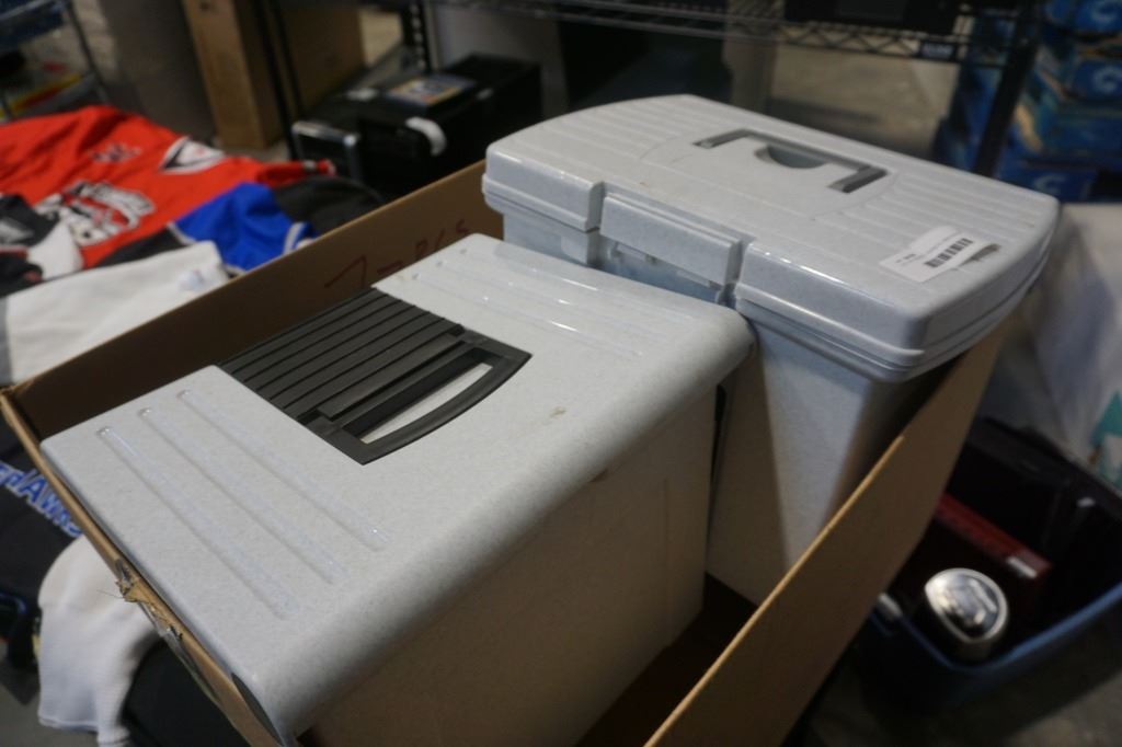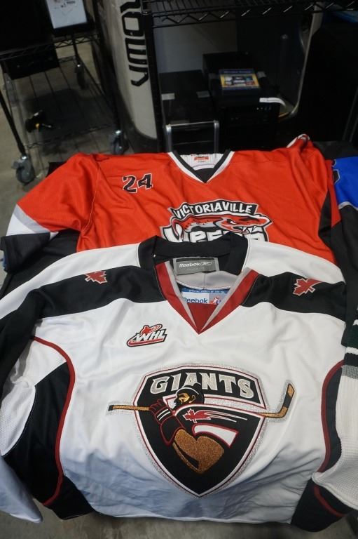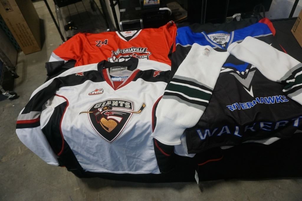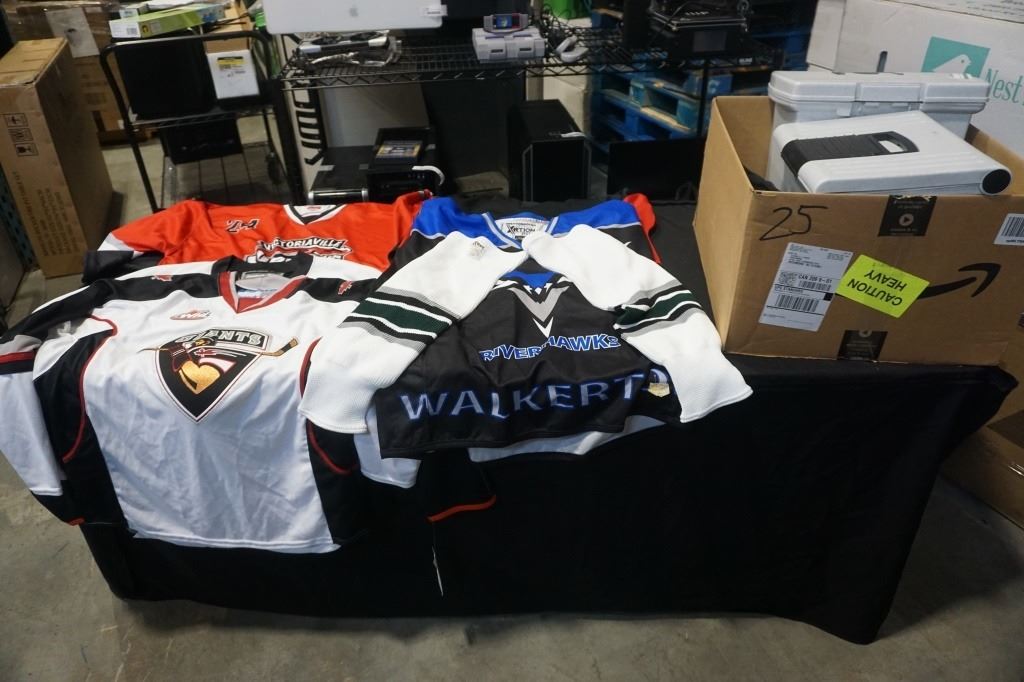 LOT OF HOCKEY JERSEYS, NEW H2X DRY SPORT SHIRTS AND 2 RUBBERMAID STORAGE BINS
