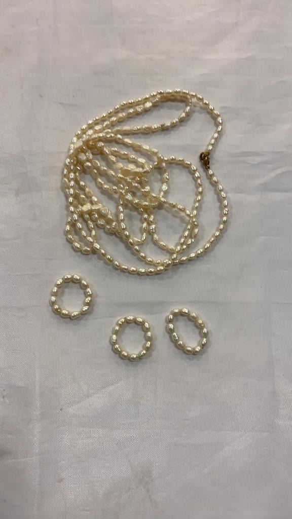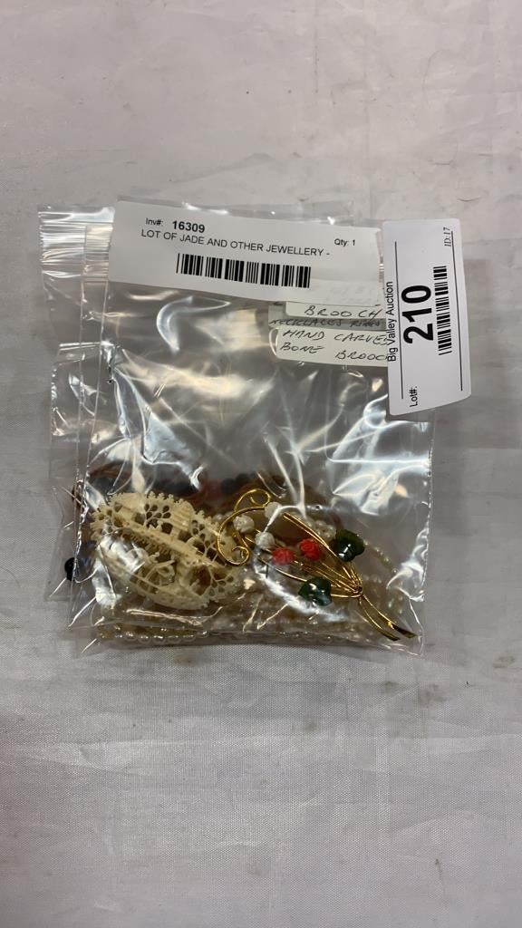 LOT OF JADE AND OTHER JEWELLERY - FRESH WATER PEARLS, HAND CARVED BONE BROOCH, CORAL AND JADE BROOCH