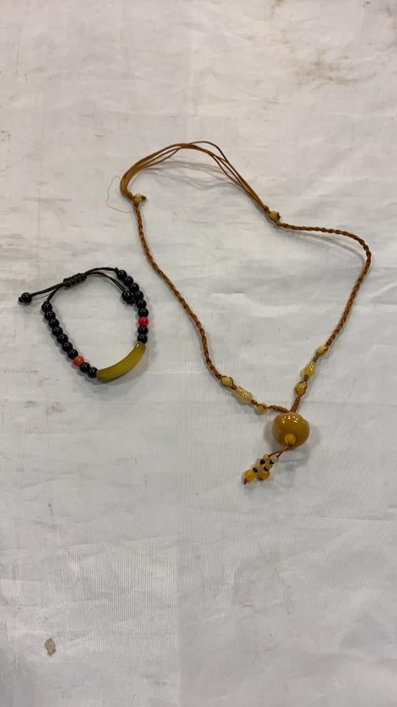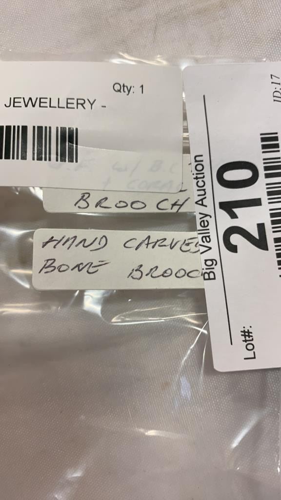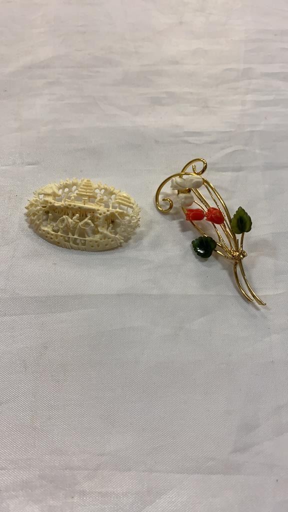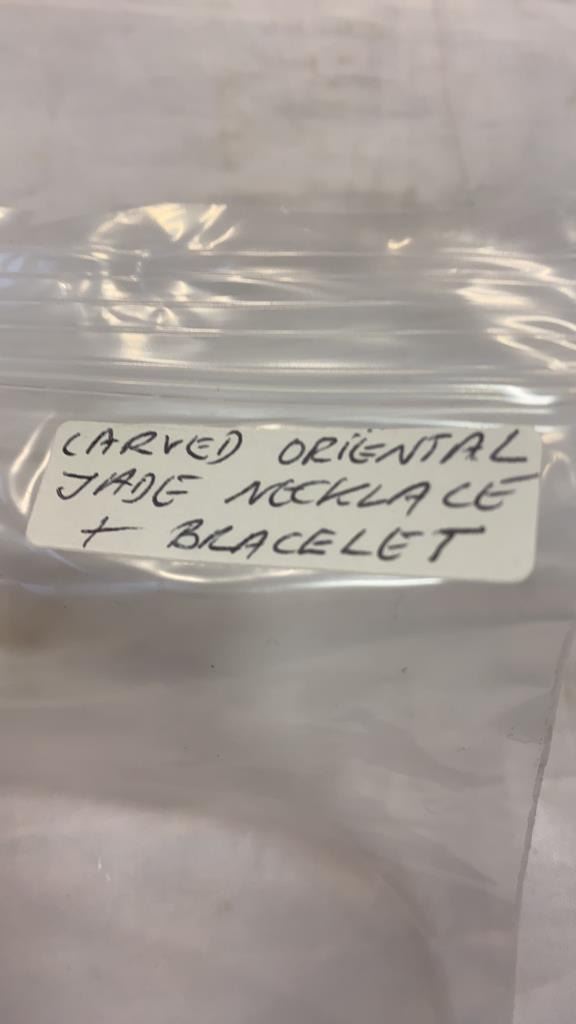 LOT OF JADE AND OTHER JEWELLERY - FRESH WATER PEARLS, HAND CARVED BONE BROOCH, CORAL AND JADE BROOCH, CARVED JADE NECKLACE AND BRACELET