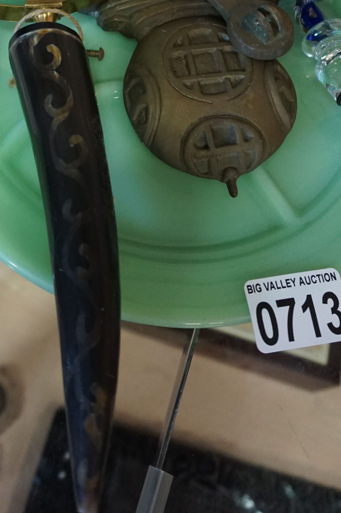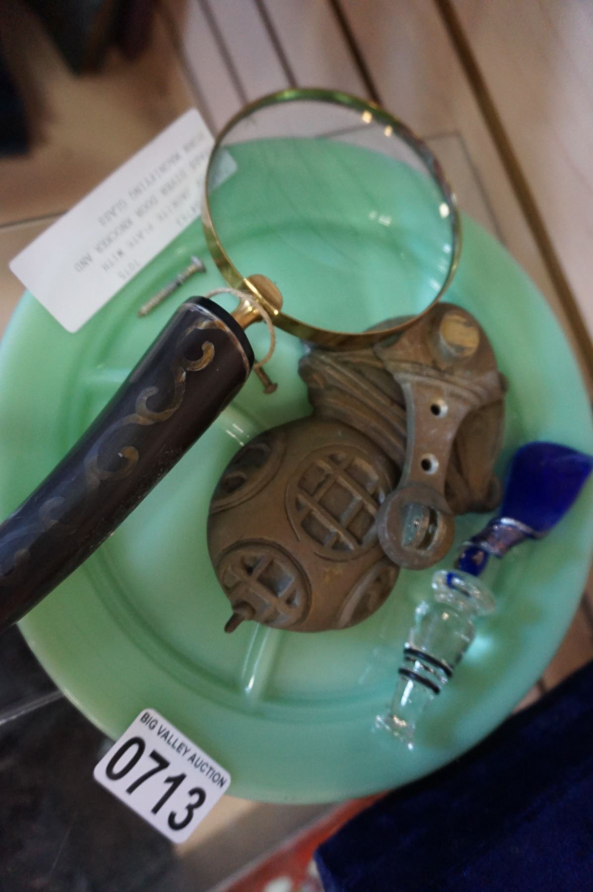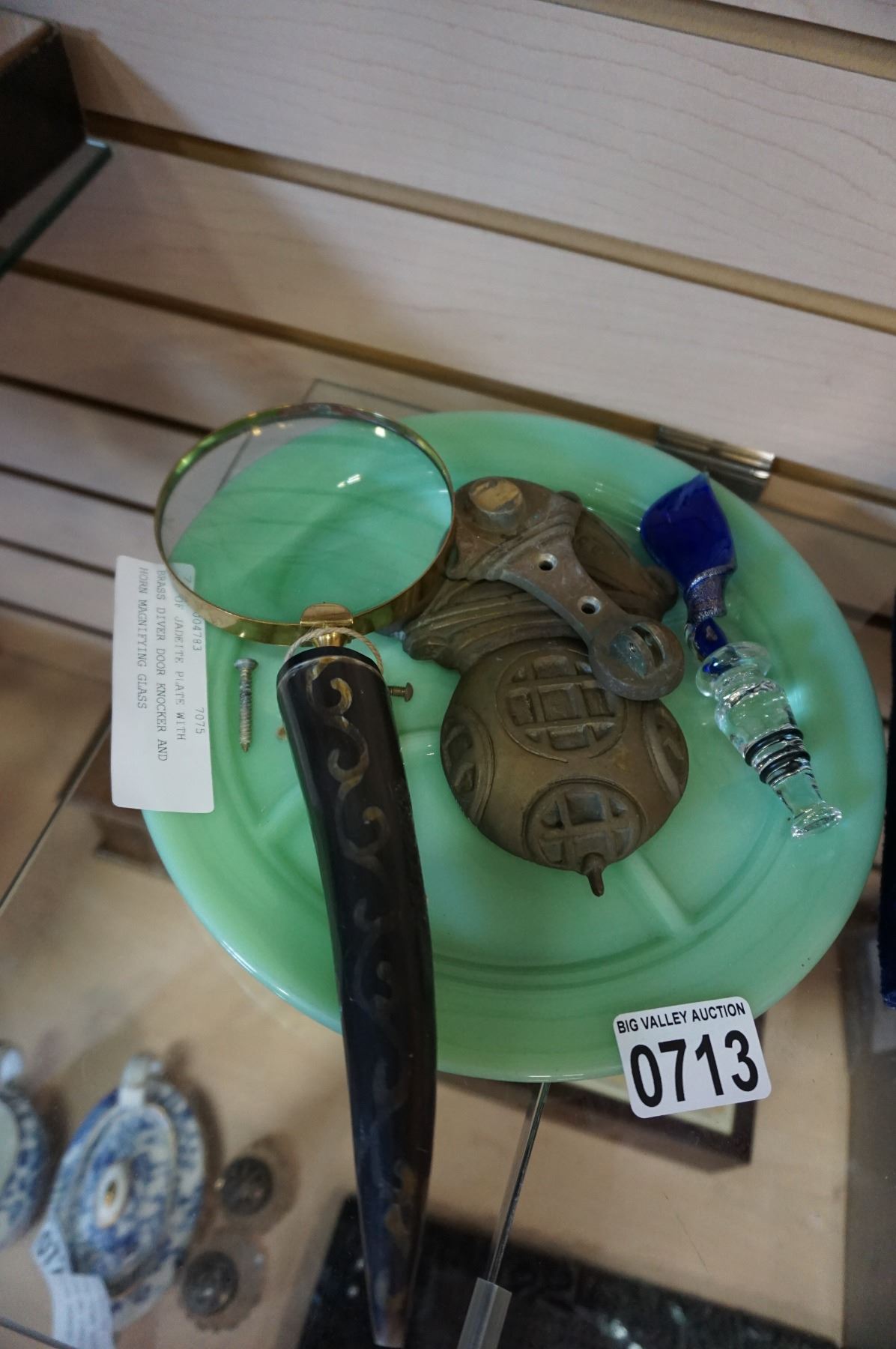 LOT OF JADEITE PLATE WITH BRASS DIVER DOOR KNOCKER AND HORN MAGNIFYING GLASS