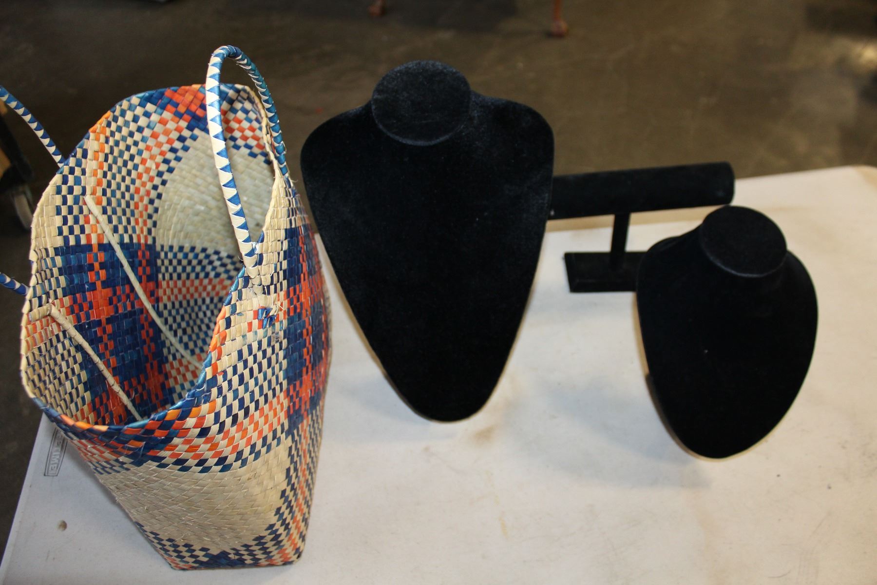 LOT OF JEWELLRY AND NECKLACE STANDS AND RATTAN BAG