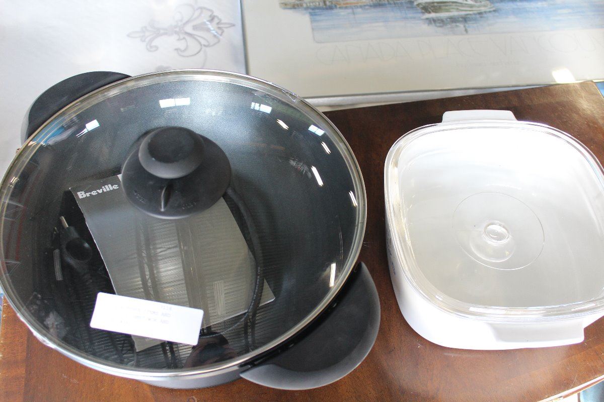 LOT OF KITCHEN ITEMS AND BREVILLE GOURMET WOK AND CORNING WARE