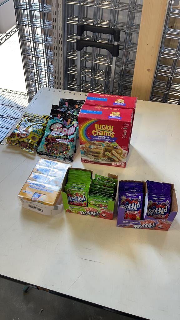 LOT OF KOOLAID DRINK MIX, HI CHEW CANDY, LUCKY CHARMS PANCAKE MIX AND SOUR CANDIES - BB MARCH 2023