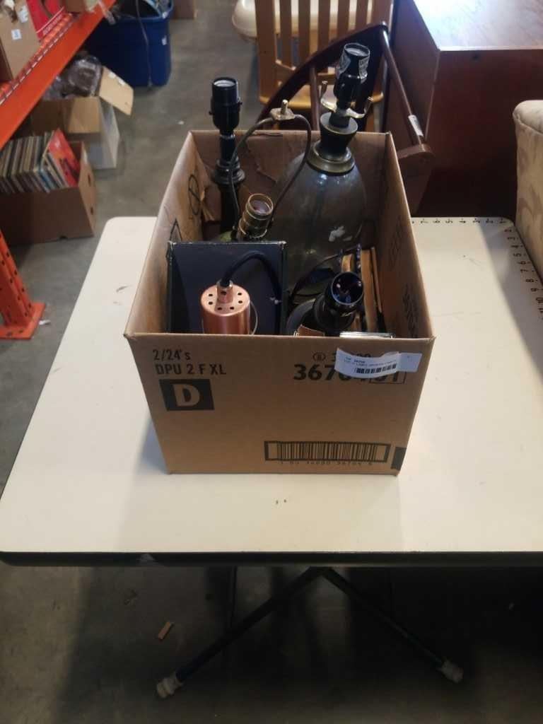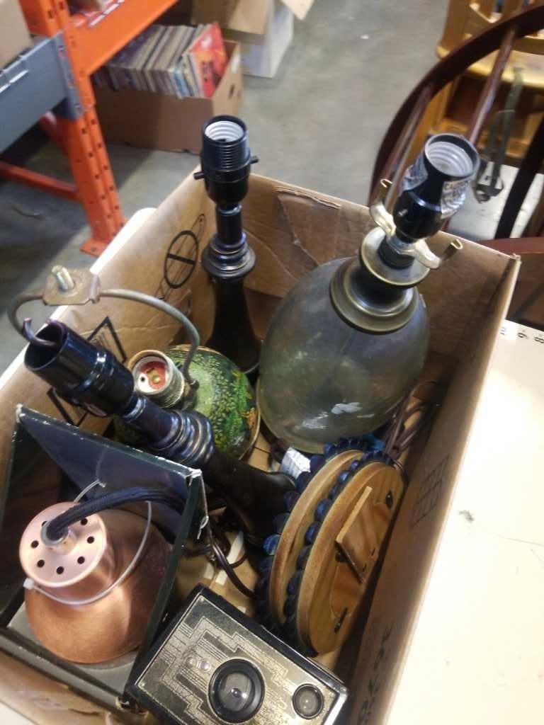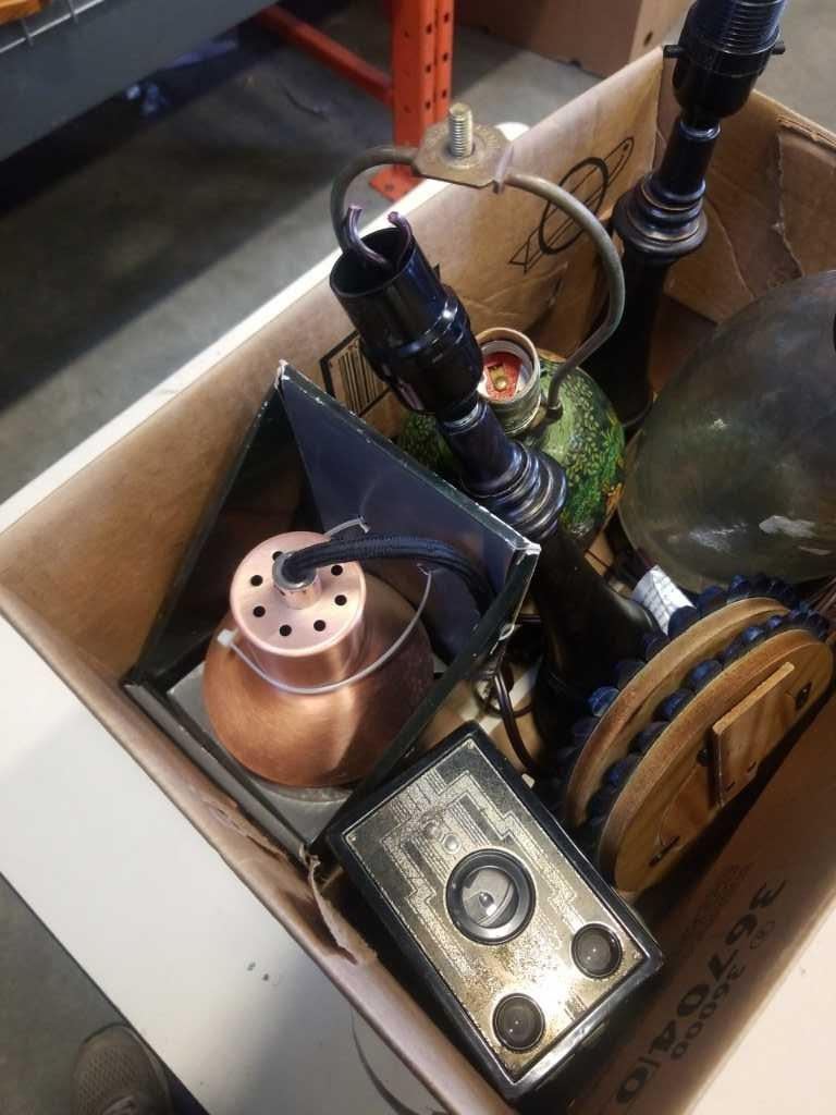 LOT OF LAMPS, BROWNIE CAMERA, COPPER LIGHT FIXTURE