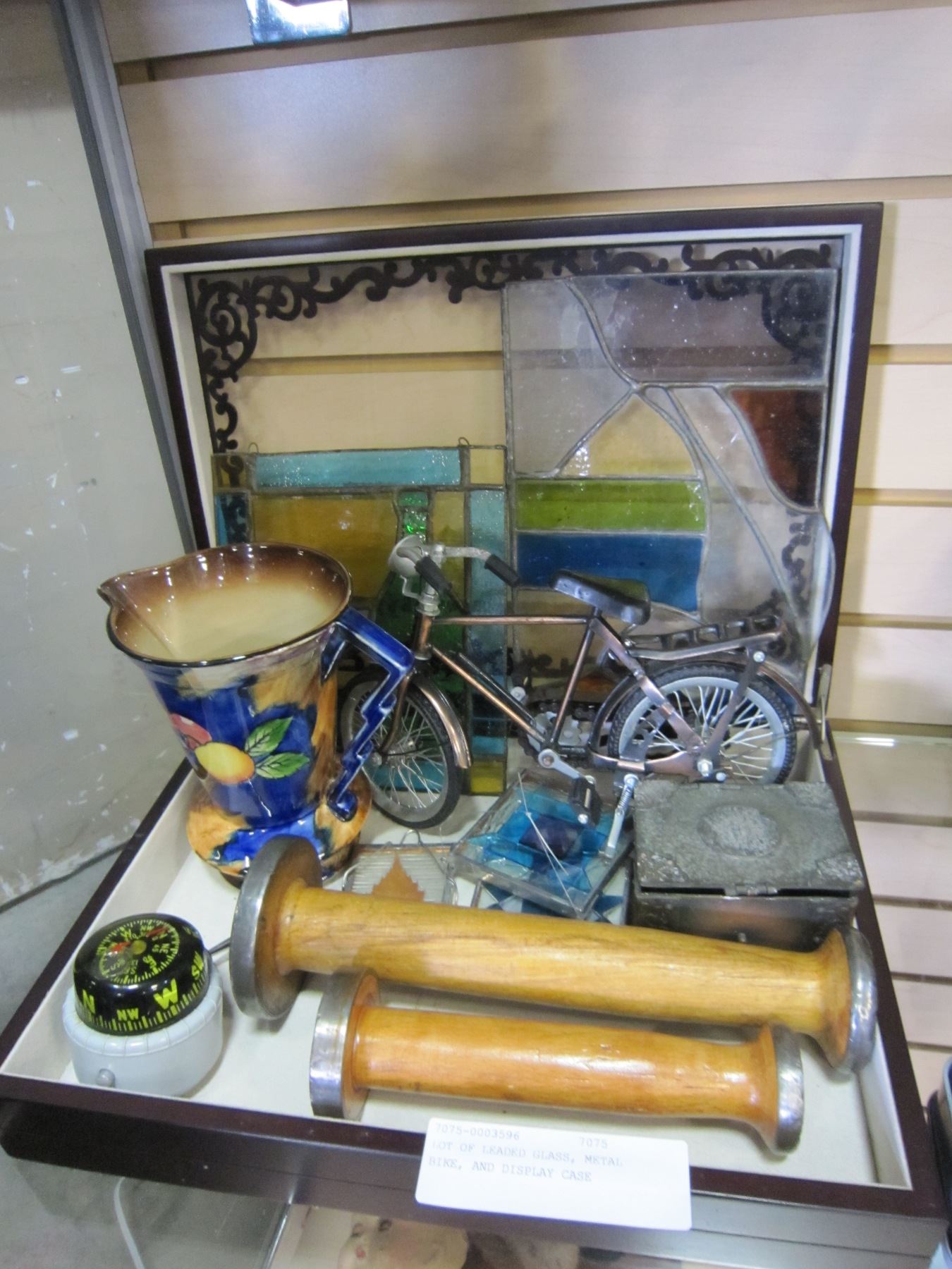 LOT OF LEADED GLASS, METAL BIKE, AND DISPLAY CASE