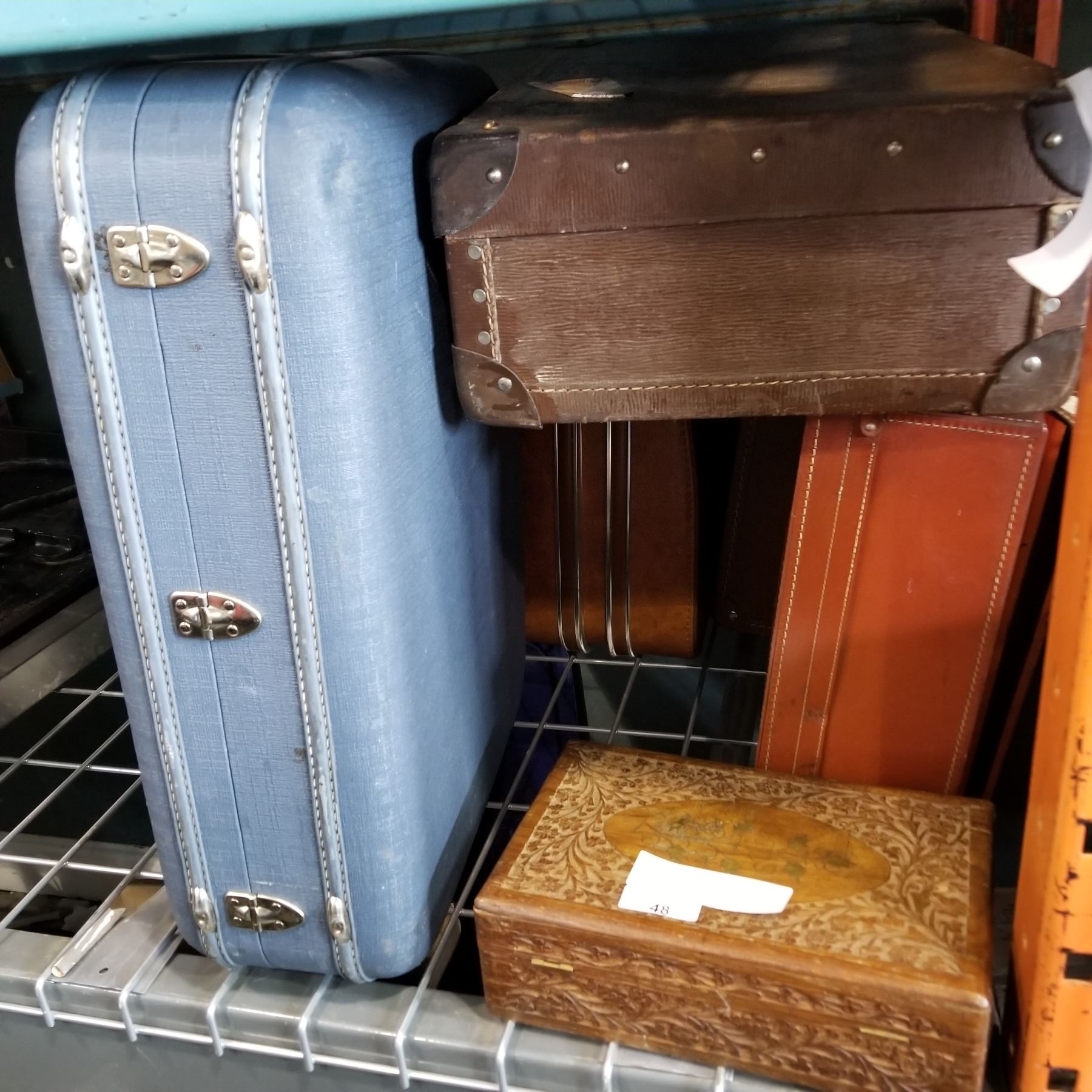 LOT OF LEATHER CASES AND CARVED WOOD BOX