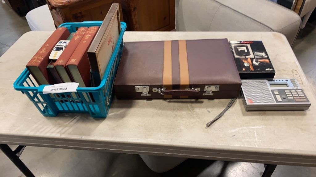 LOT OF LEONARDO DA VINCI BOOKS, BACKGAMMON SET, VINTAGE RADIO AND RAZOR