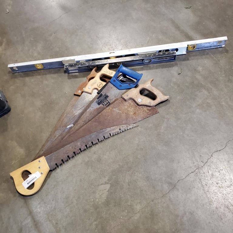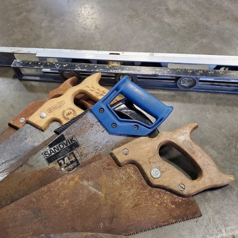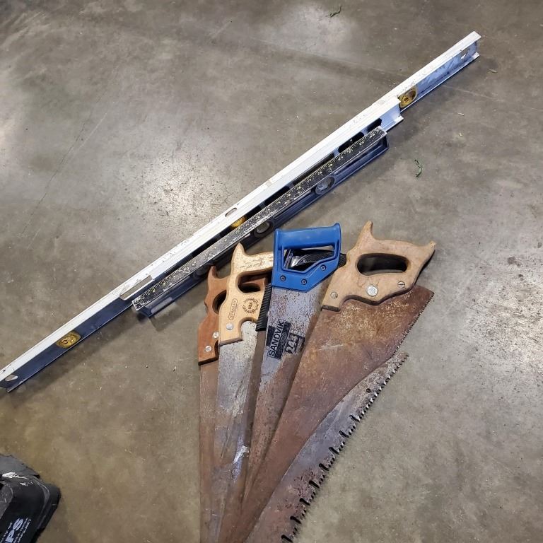 LOT OF LEVELS AND HAND SAWS