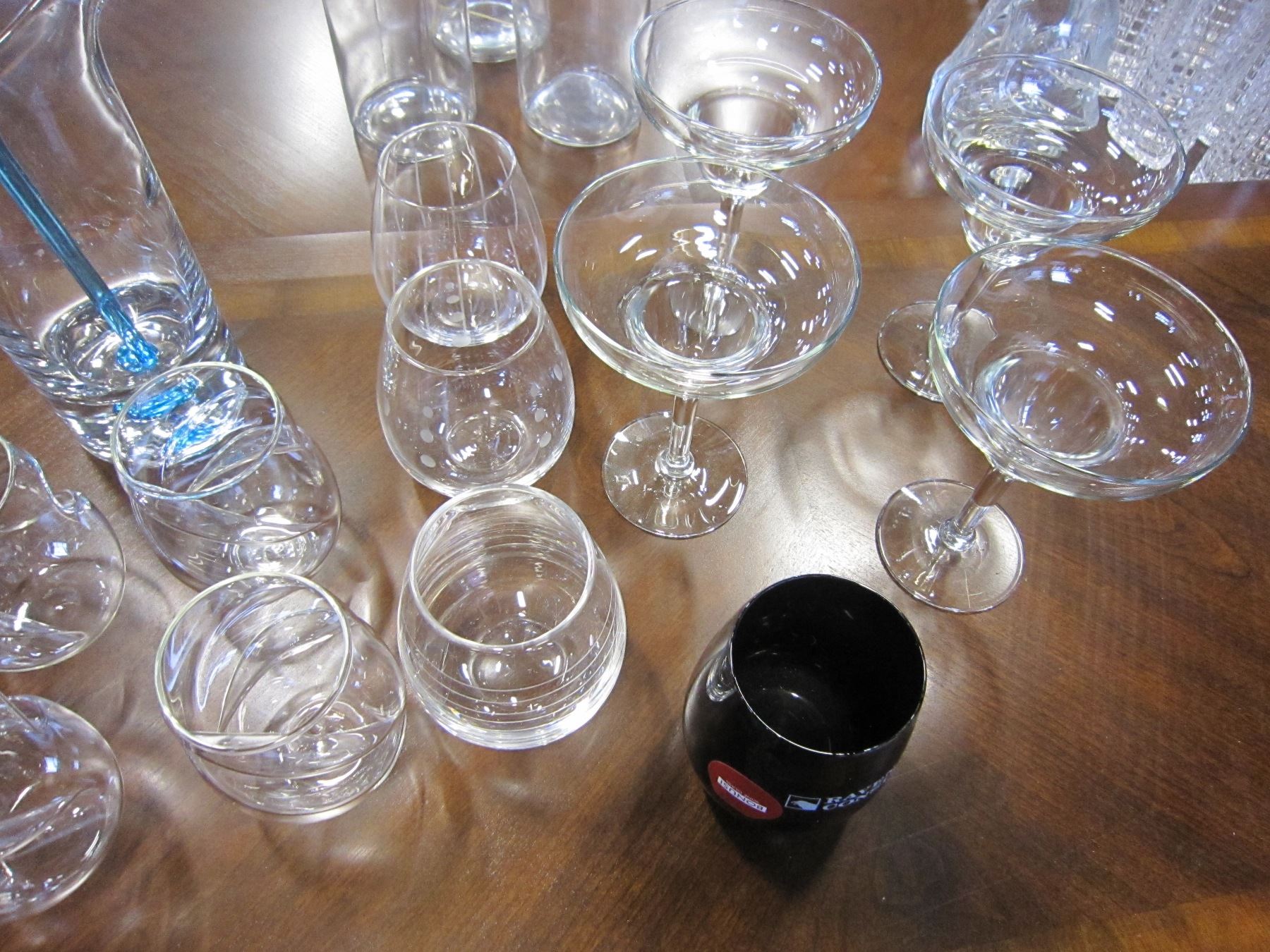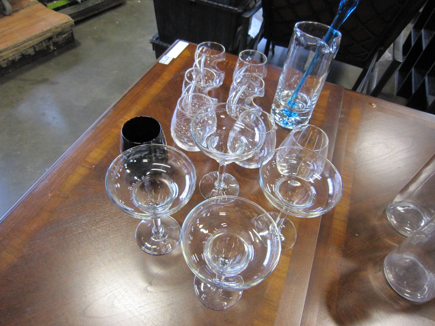 LOT OF MARTINI GLASSES AND STEMLESS WINE GLASSES & BLUE ART GLASS DRINK MIXER