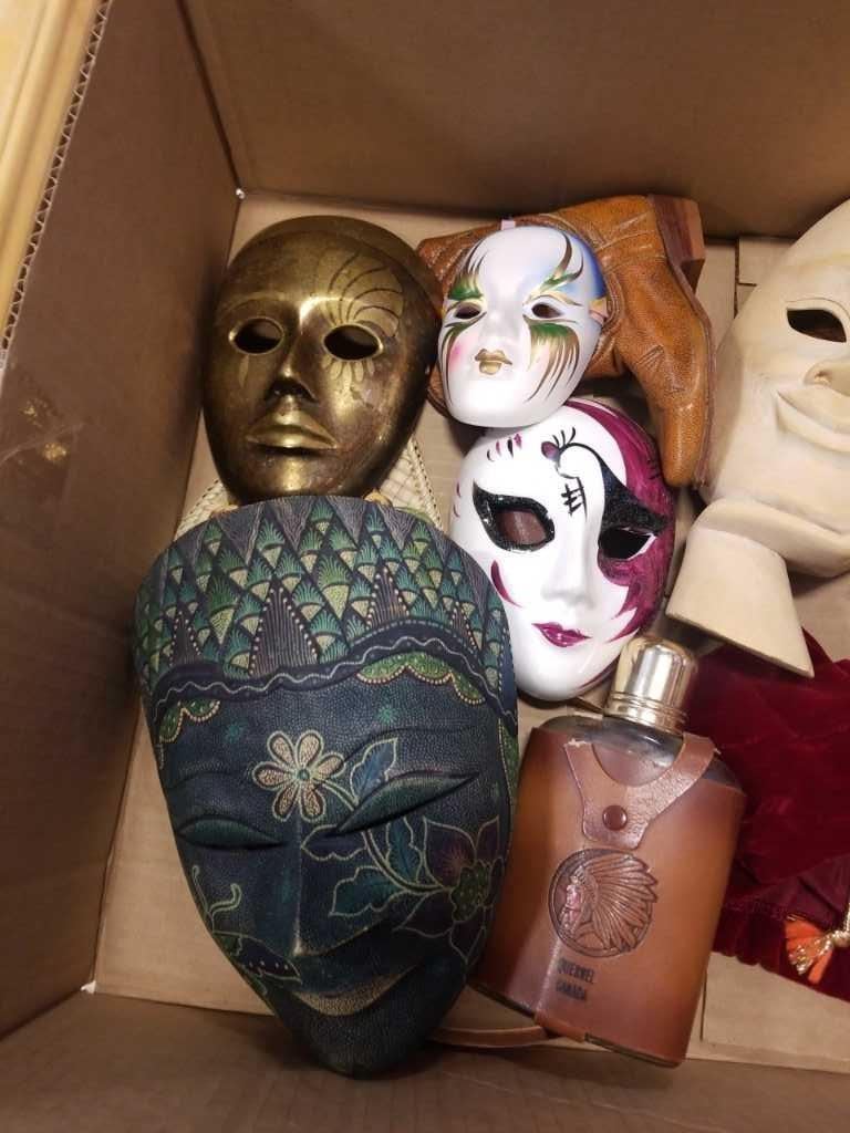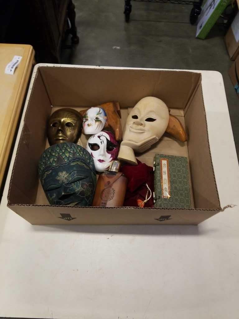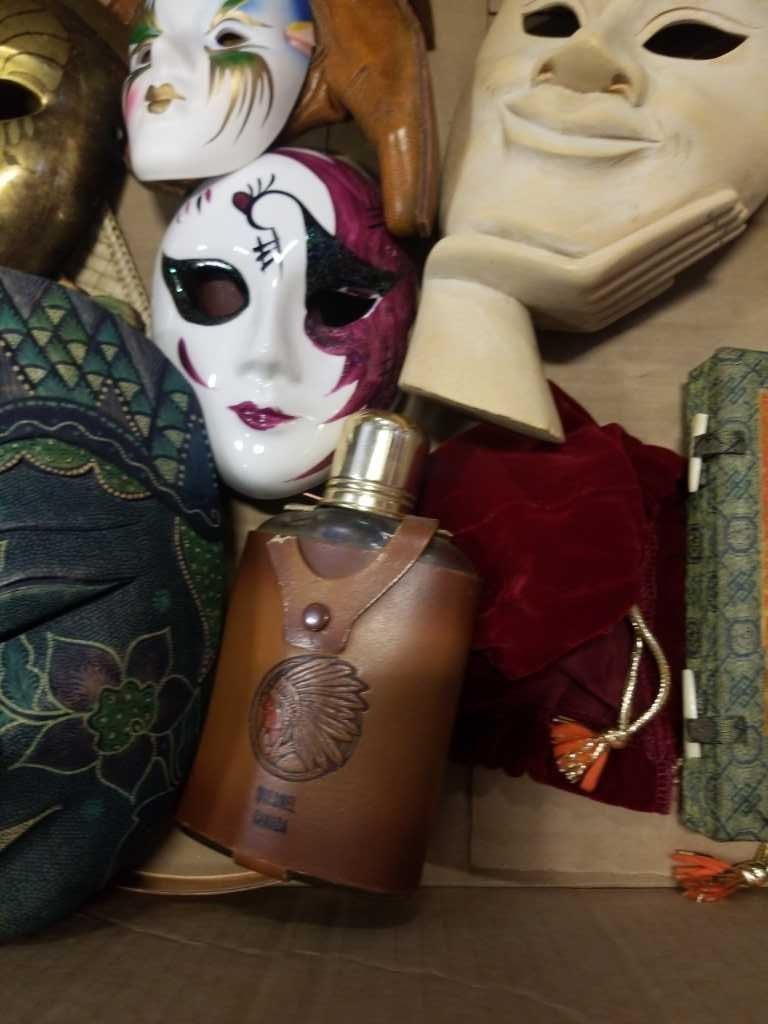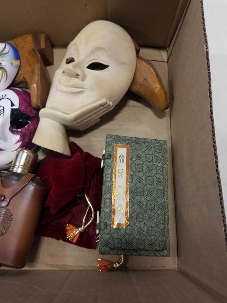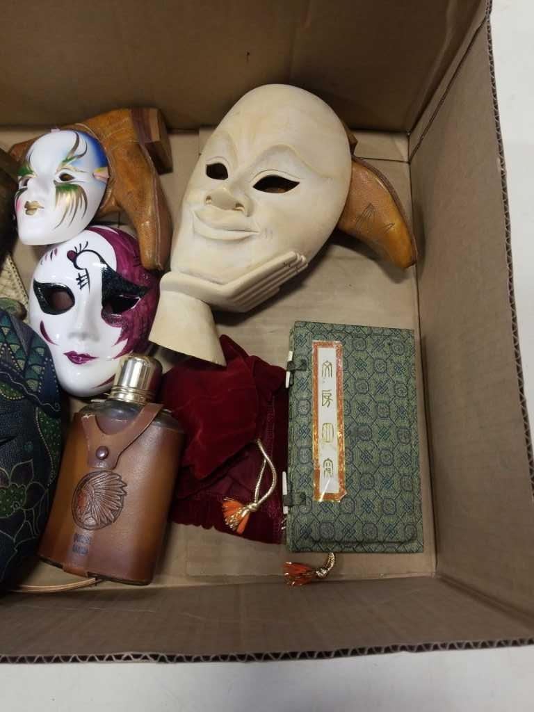 LOT OF MASKS, FLASK, CALLIGRAPHY SET