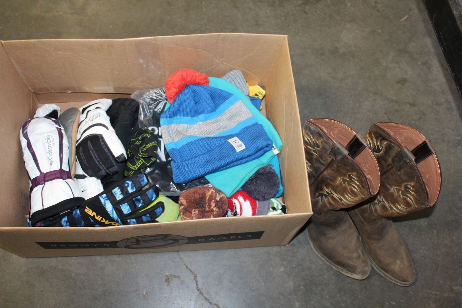 LOT OF MENS AND WOMENS SKI GLOVES AND BEANIES AND COWBOY BOOTS