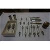 LOT OF METAL AND GLASS BUTTER KNIVES, WINE STOPPERS, SKEWERS