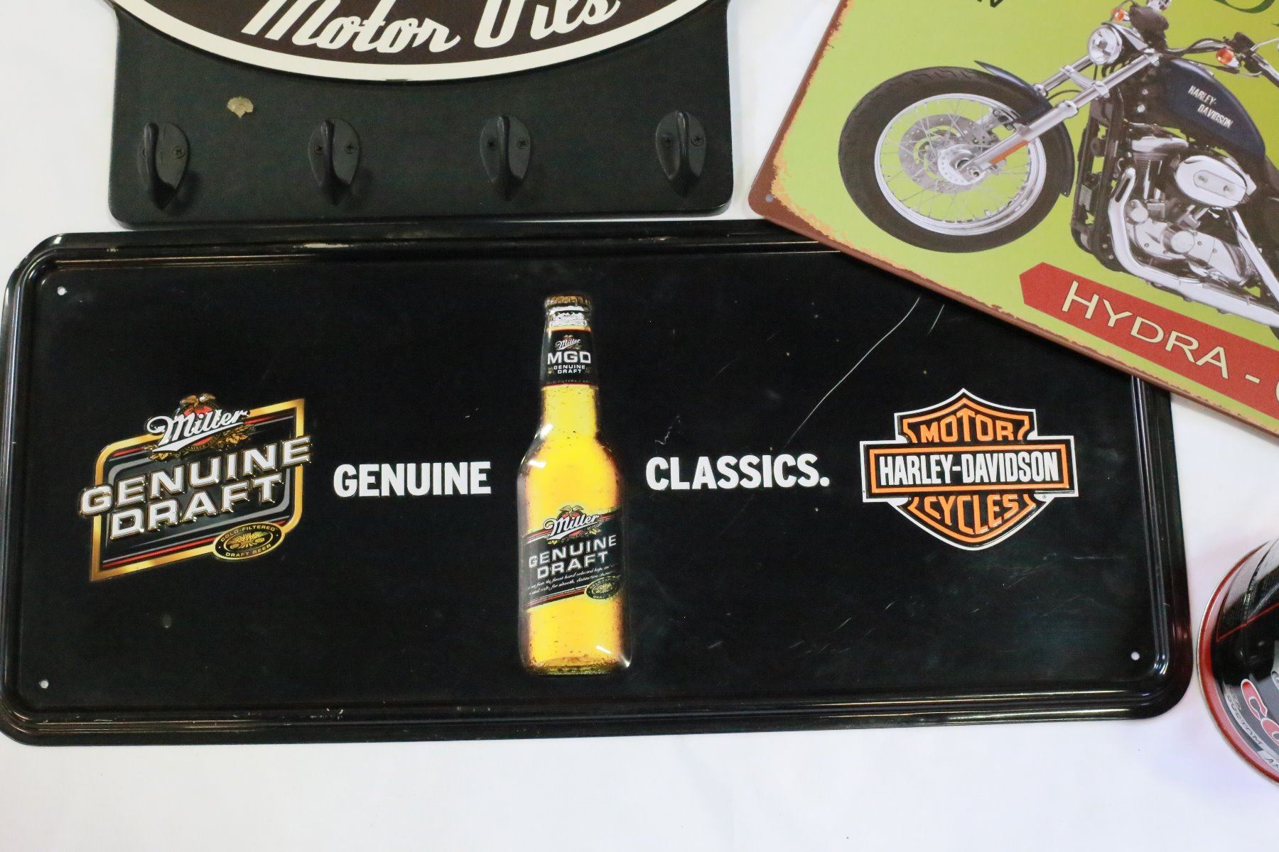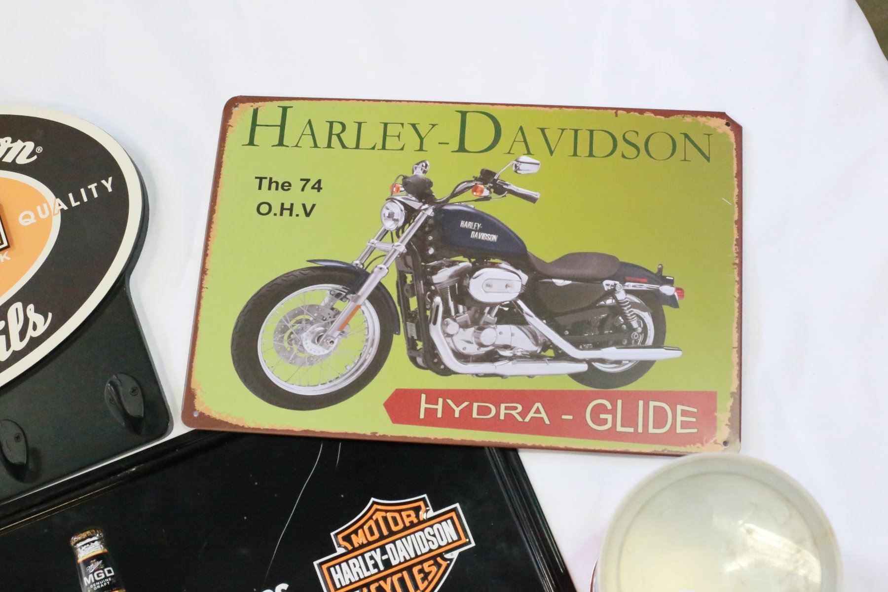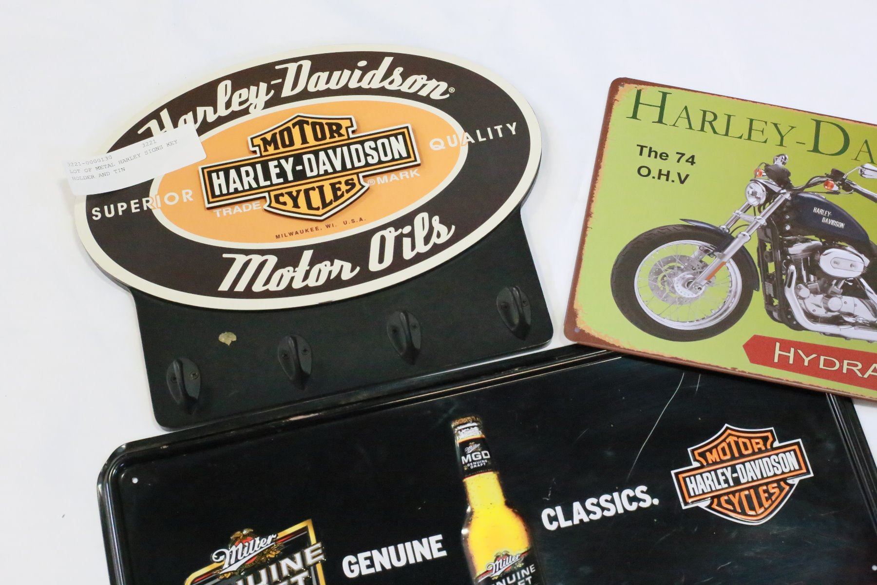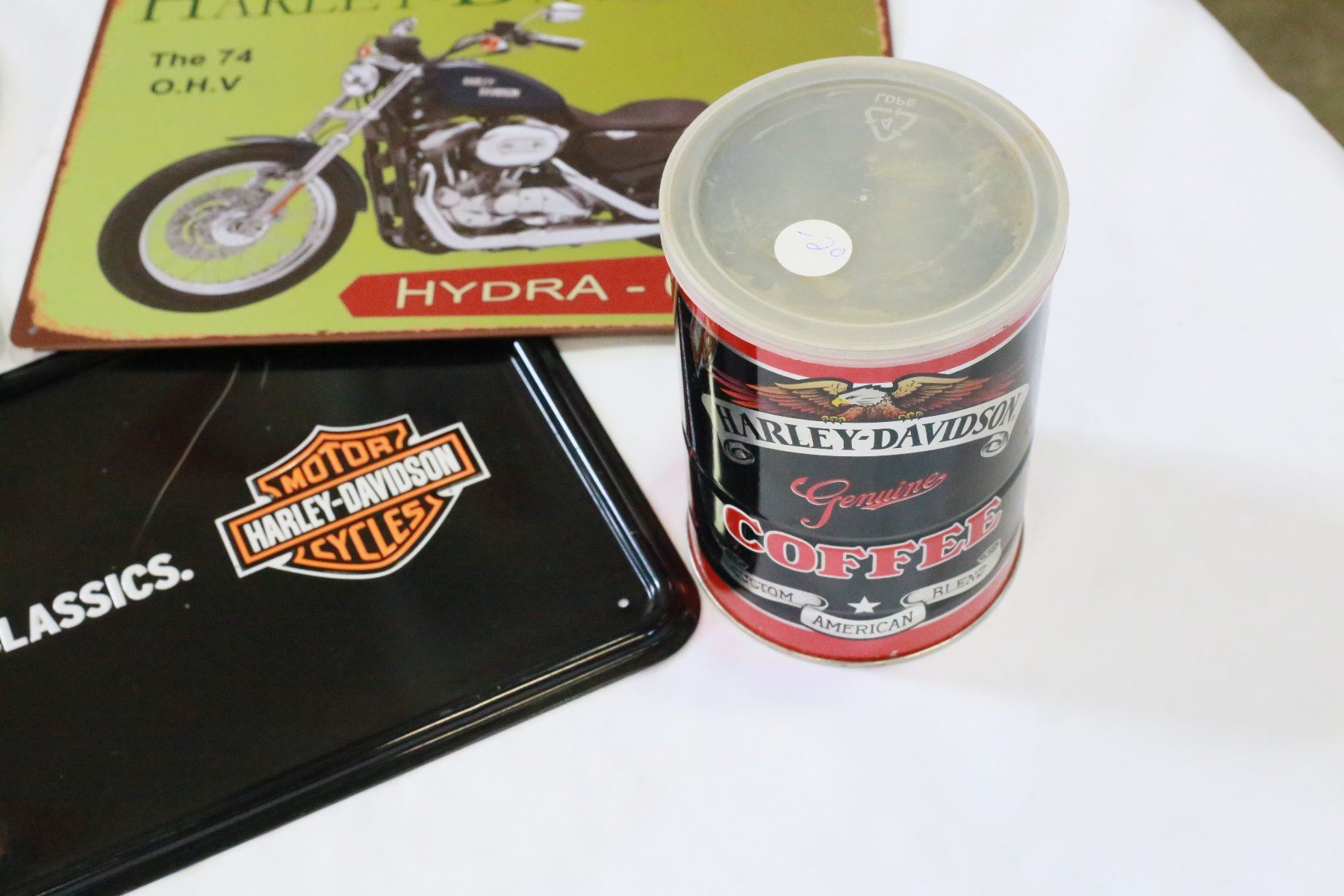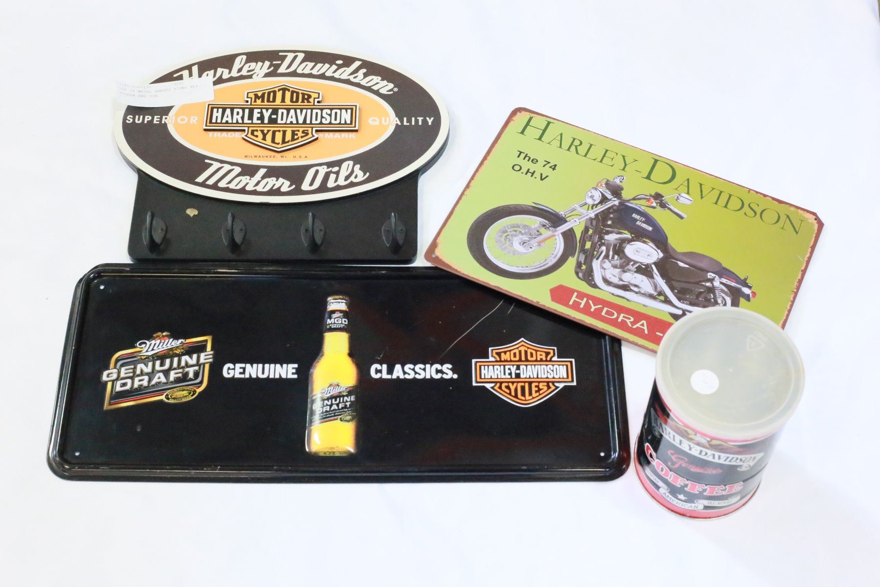 LOT OF METAL HARLEY SIGNS KEY HOLDER AND TIN