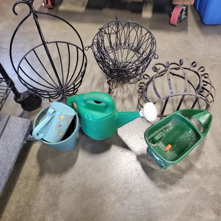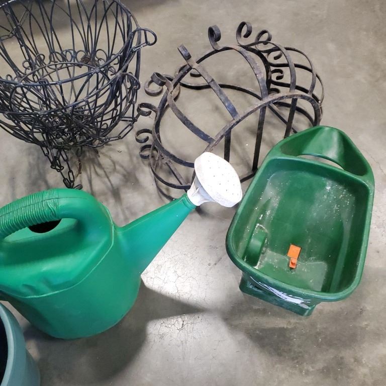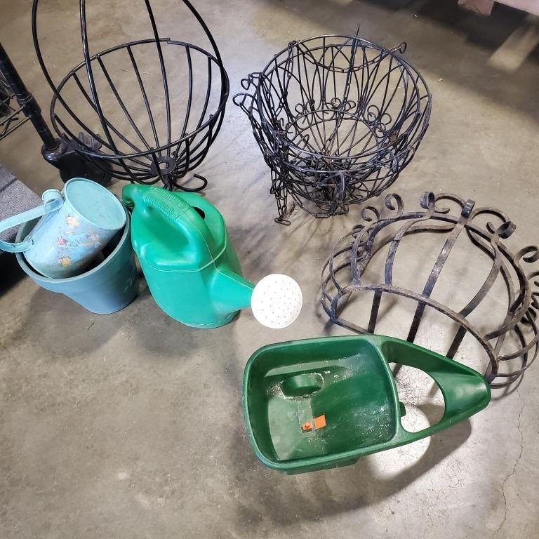 LOT OF METAL PLANT HOLDERS, FLOWER POT, SEED SPREADER, AND WATERING CAN
