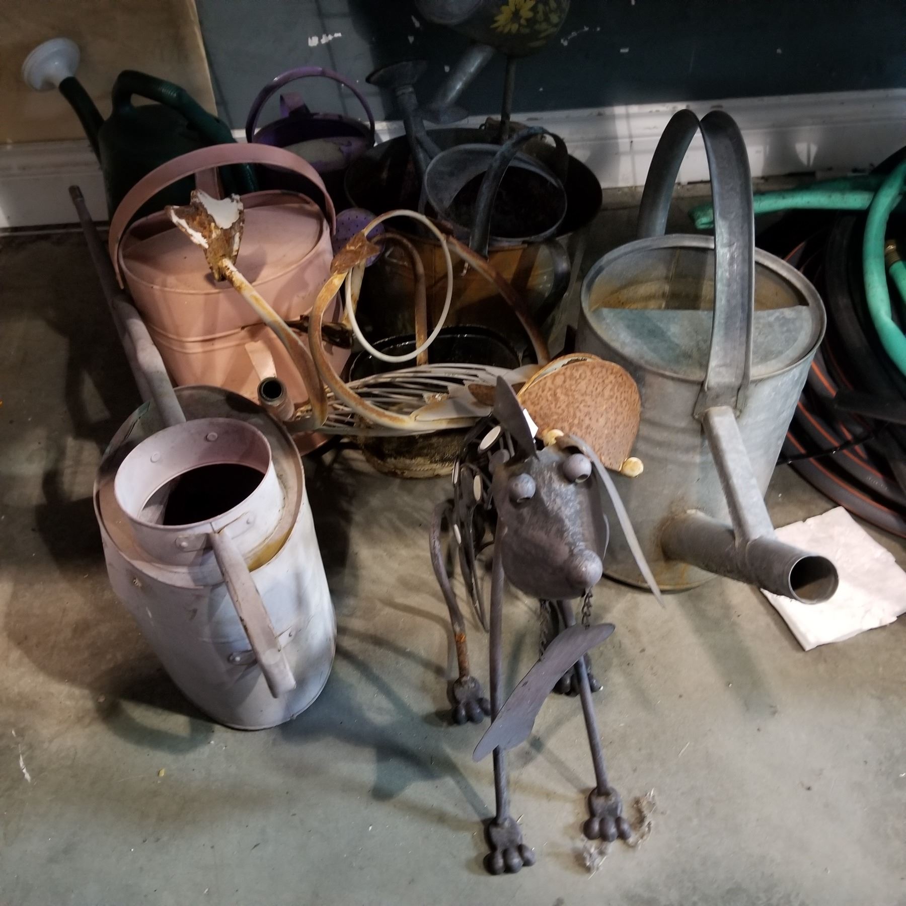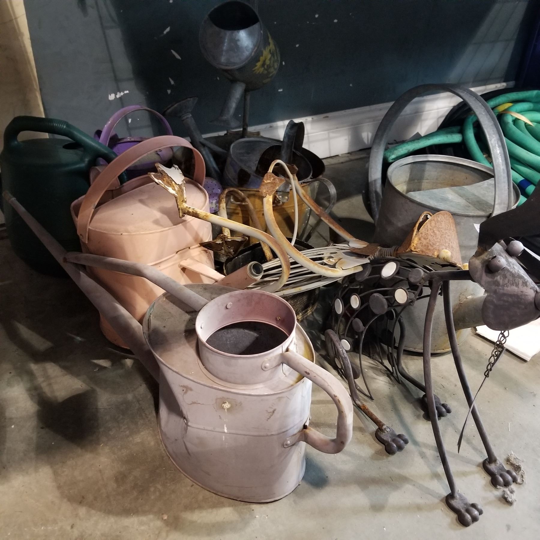 LOT OF METAL WATERING CANS AND GARDEN DECOR