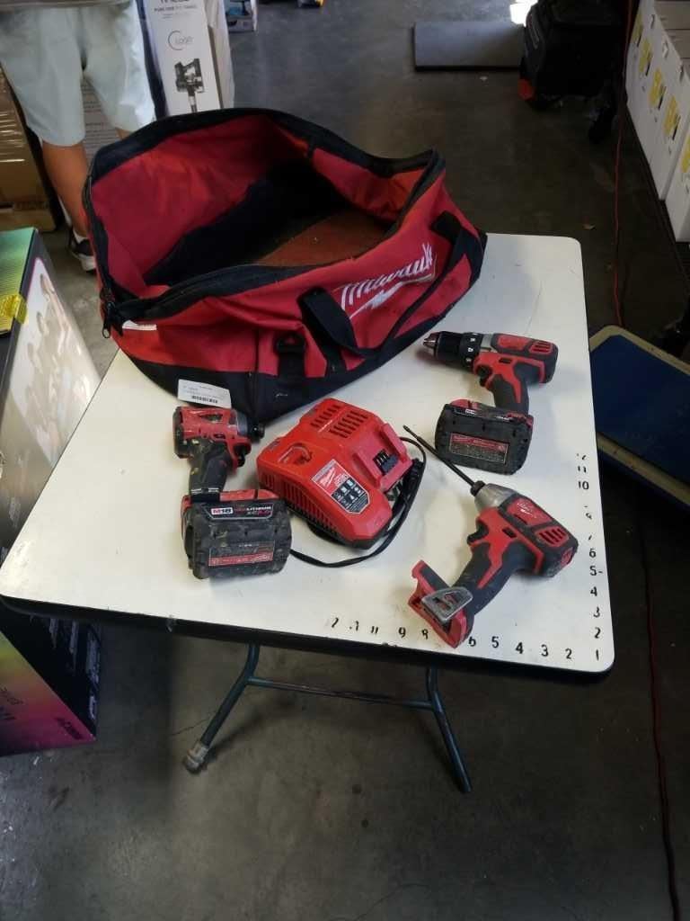 LOT OF MILWAUKEE CORDLESS POWER TOOLS - IMPACT DRIVER, BRUSHLESS IMPACT DRIVER AND DRILL DRIVER WITH 2 BATTERIES AND CHARGER TESTED AND WORKING