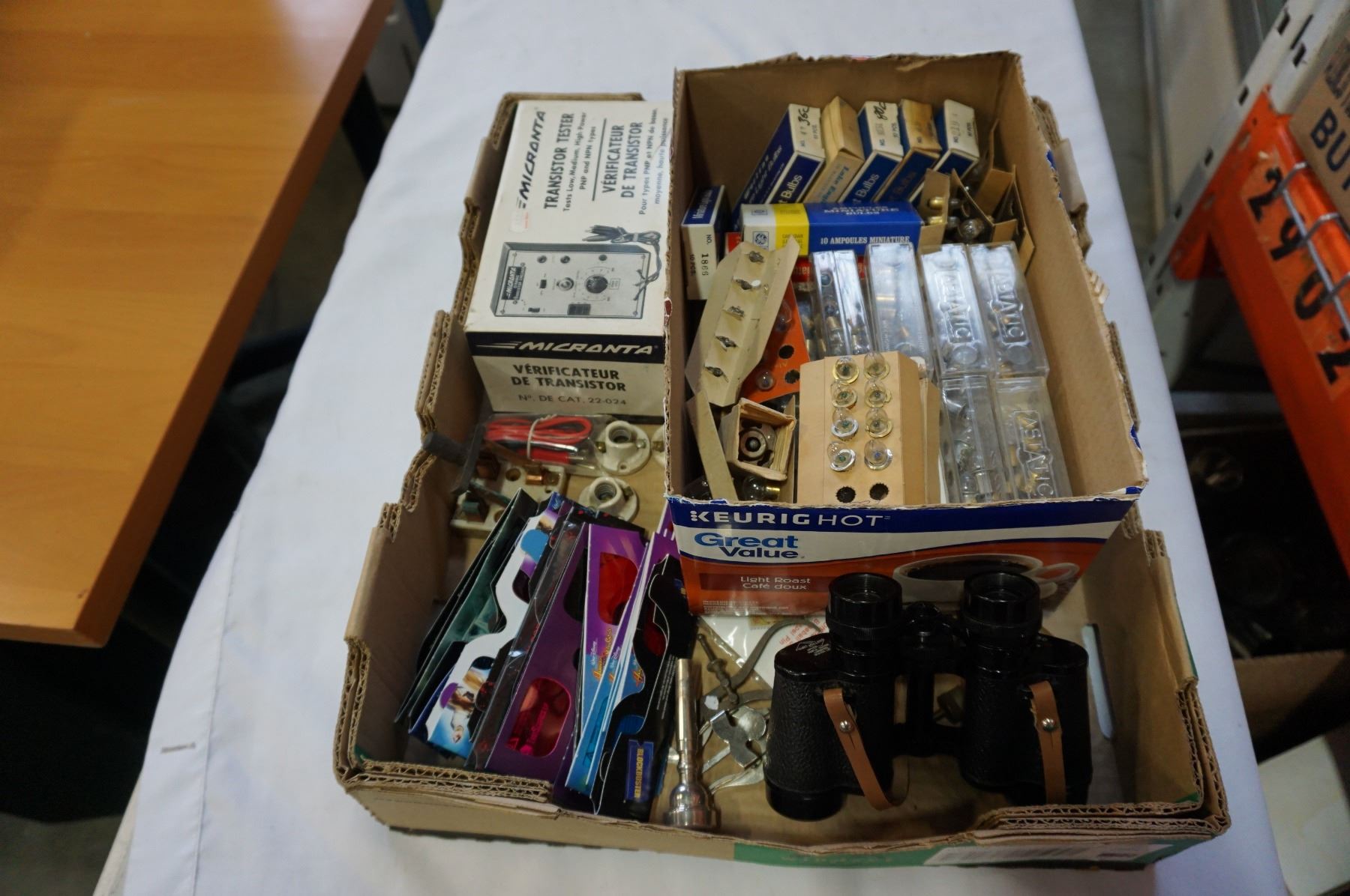 LOT OF MINIATURE LIGHT BULBS, BINOCULARS, AND TRANSISTOR TESTERS