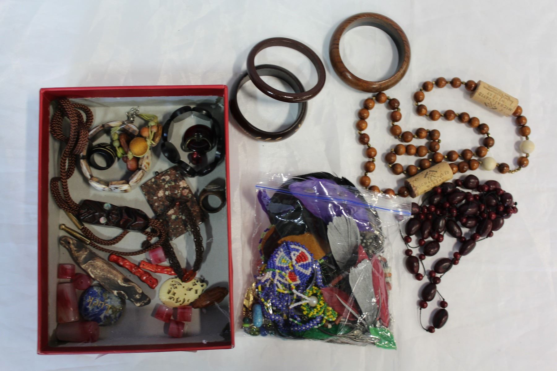 LOT OF NATIVE BEADED AND FEATHER JEWELLRY AND NATIVE WOOD JEWELLRY
