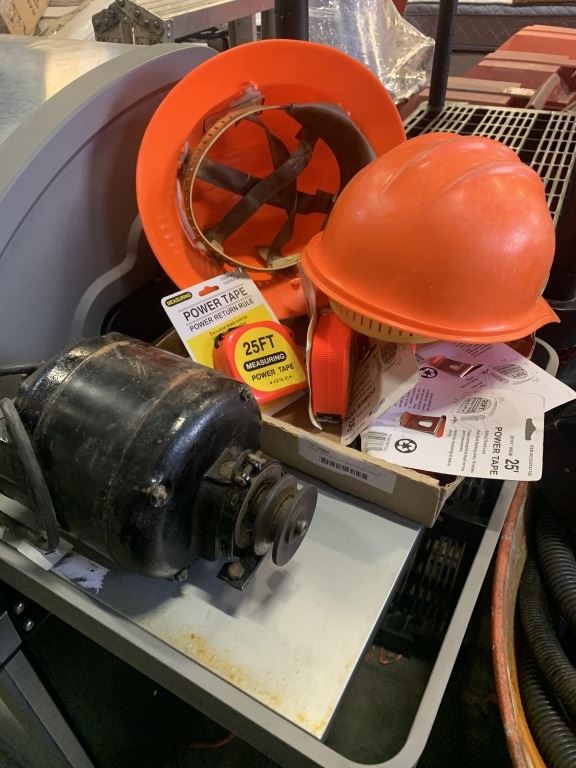 LOT OF NEW 25 FOOT MEASURING TAPES, BUNGEE CORDS, 2 HARD HATS AND ELECTRIC MOTOR