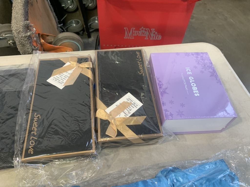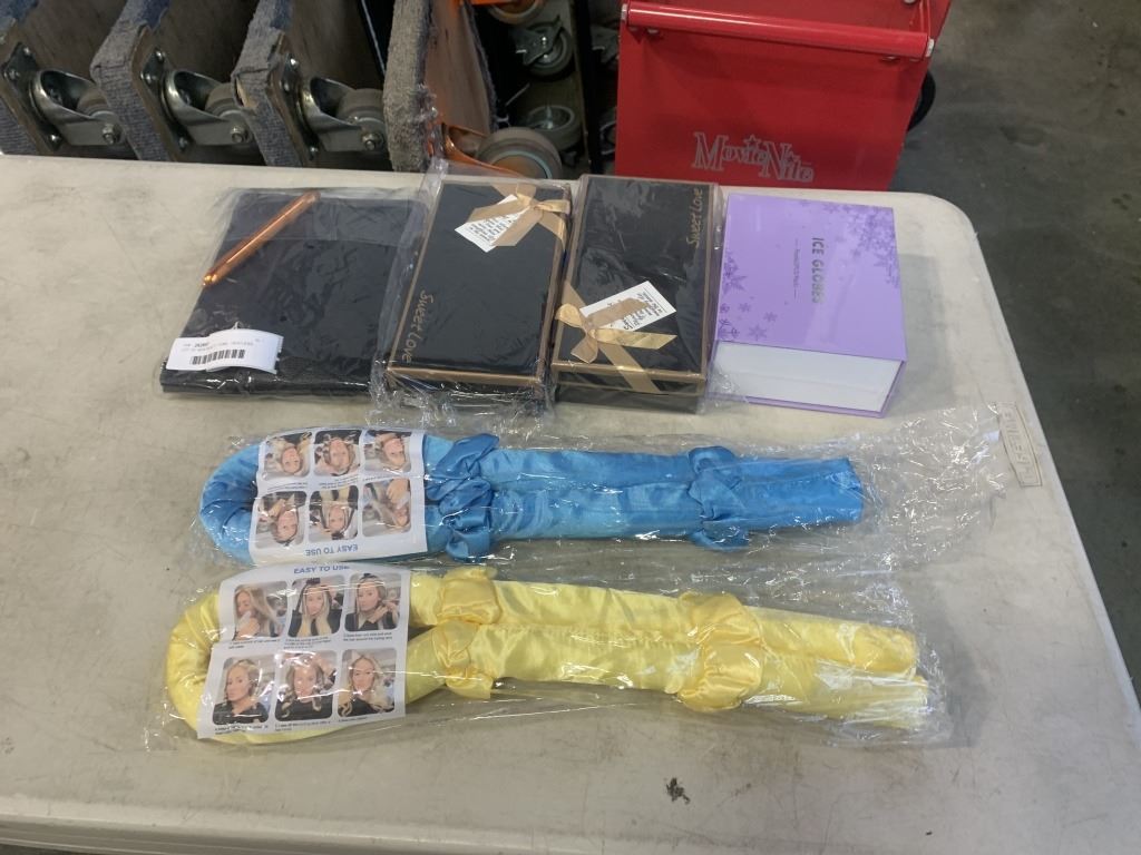 LOT OF NEW BEAUTY ITEMS - HEATLESS CURLER, MAKEUP BACK W/ BRUSHES, EYE LINER, ROSE SOAP GIFT BOX, AND ICE GLOBES