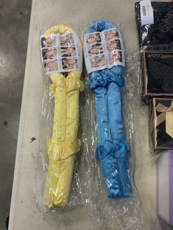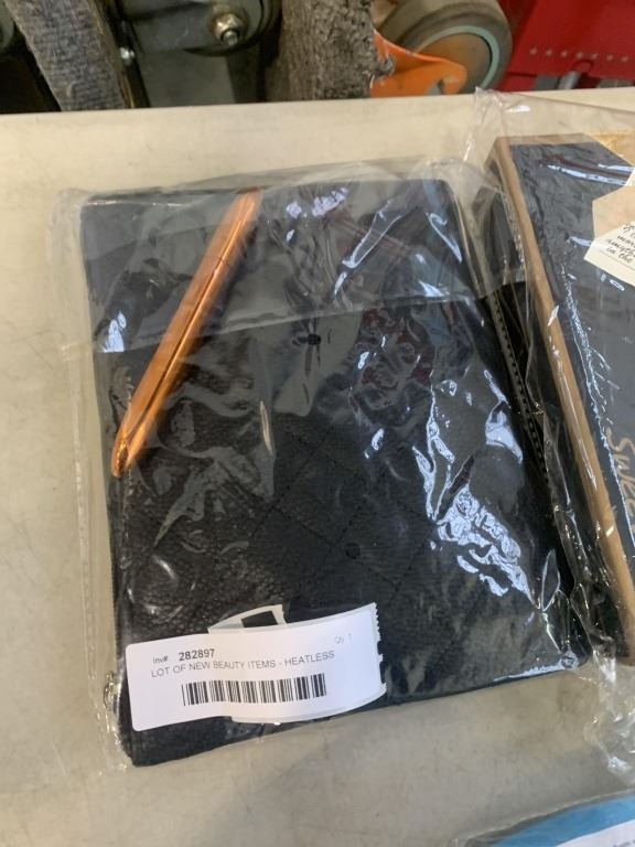LOT OF NEW BEAUTY ITEMS - HEATLESS CURLER, MAKEUP BACK W/ BRUSHES, EYE LINER, ROSE SOAP GIFT BOX, AN