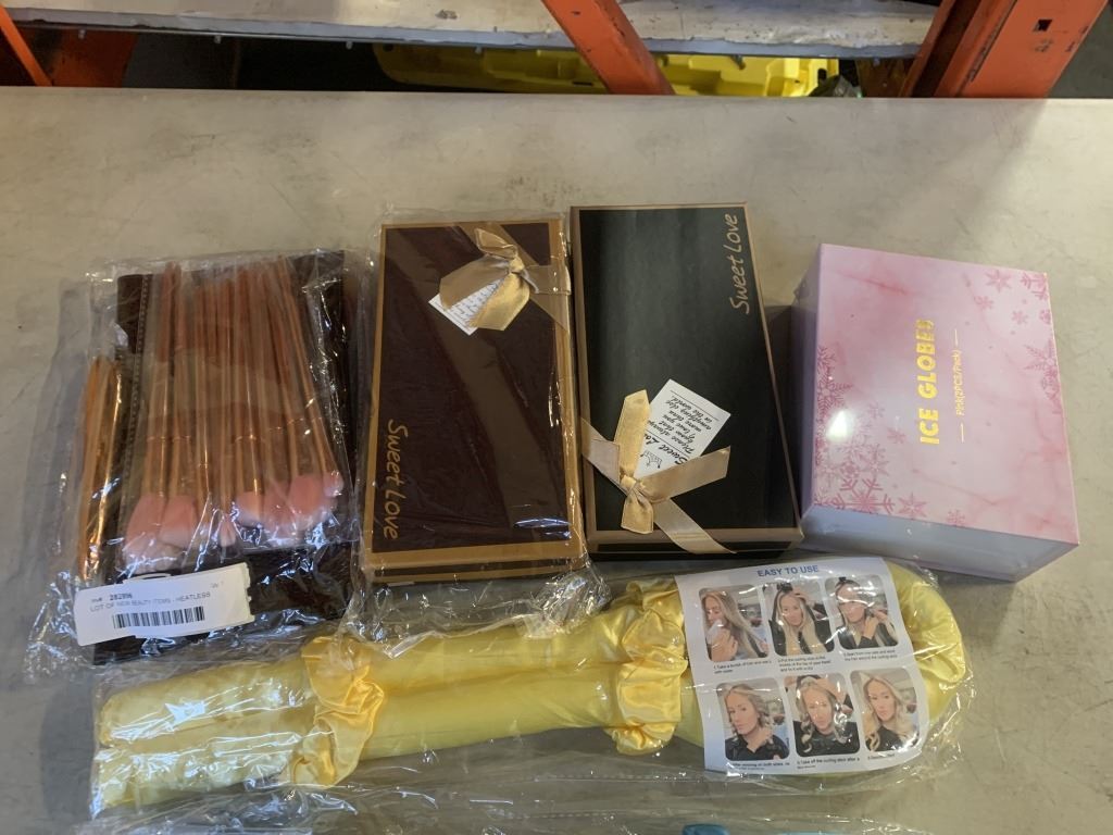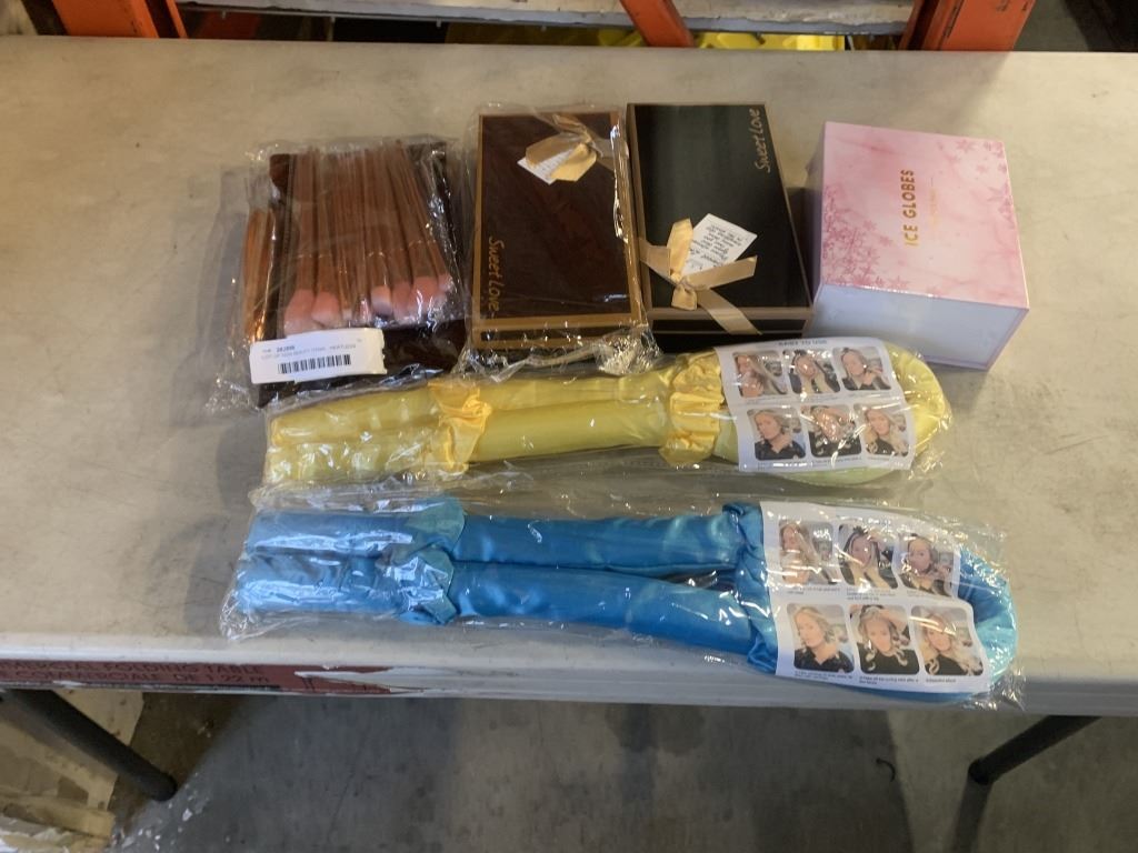 LOT OF NEW BEAUTY ITEMS - HEATLESS CURLER, MAKEUP BACK W/ BRUSHES, EYE LINER, ROSE SOAP GIFT BOX, AND ICE GLOBES