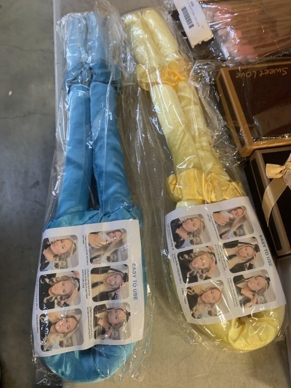 LOT OF NEW BEAUTY ITEMS - HEATLESS CURLER, MAKEUP BACK W/ BRUSHES, EYE LINER, ROSE SOAP GIFT BOX, AN