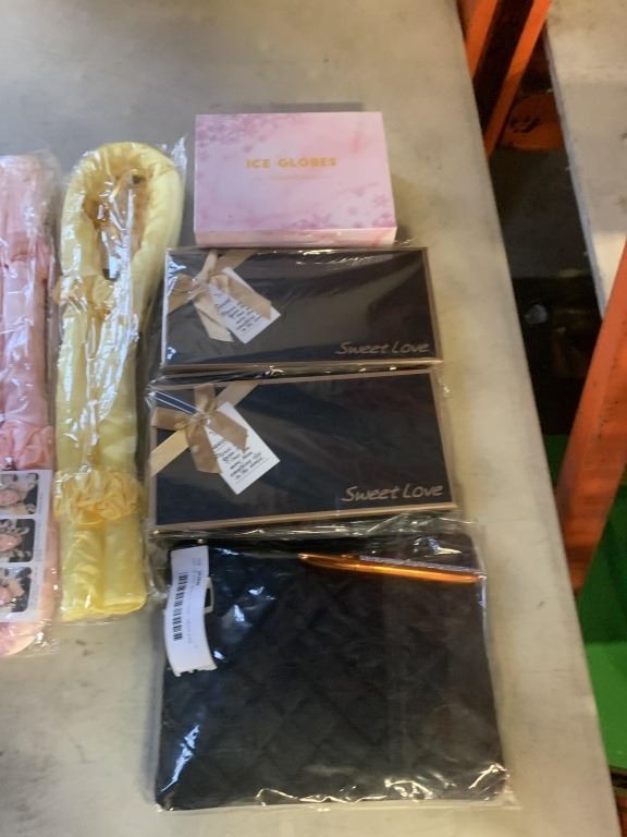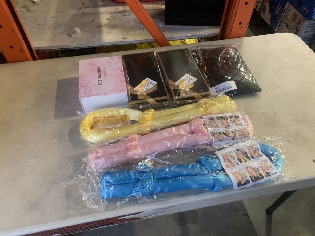 LOT OF NEW BEAUTY ITEMS - HEATLESS CURLER, MAKEUP BACK W/ BRUSHES, EYE LINER, ROSE SOAP GIFT BOX, AND ICE GLOBES