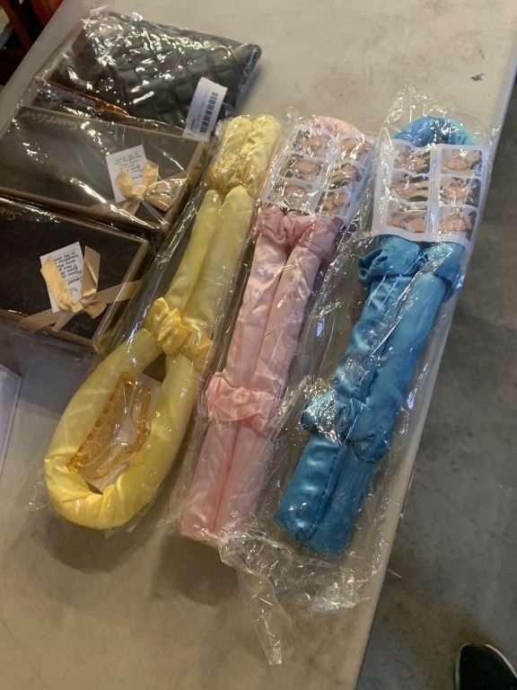 LOT OF NEW BEAUTY ITEMS - HEATLESS CURLER, MAKEUP BACK W/ BRUSHES, EYE LINER, ROSE SOAP GIFT BOX, AN