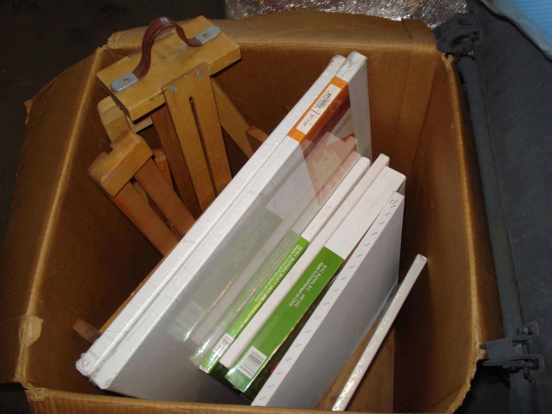 LOT OF NEW CANVAS AND THREE ARTIST EASELS