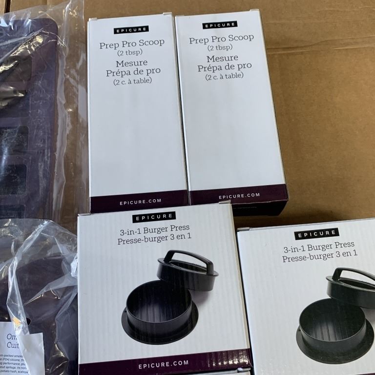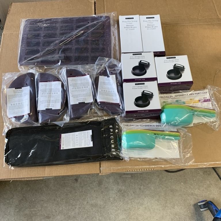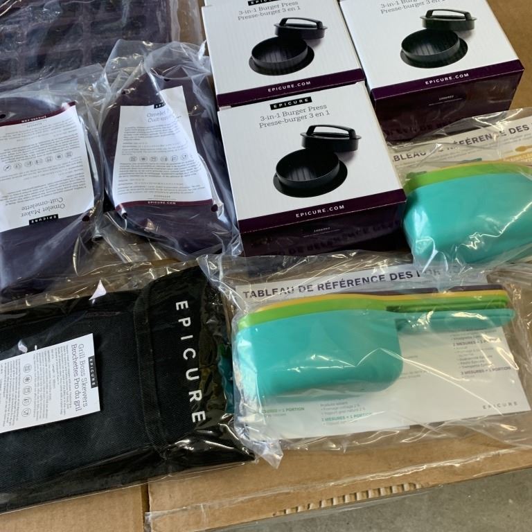 LOT OF NEW EPICURE COOKING SUPPLIES PERFECT 4 OMELETTE MAKERS, PETITES SILICONE BAKING SHEET, 3 BUREGER PRESSES, 2 STAINLESS 2 TBSP SCOOPS, 2 SETS OF PERFECT PORTION SCOOPS AND GRILL BOSS SKEWERS