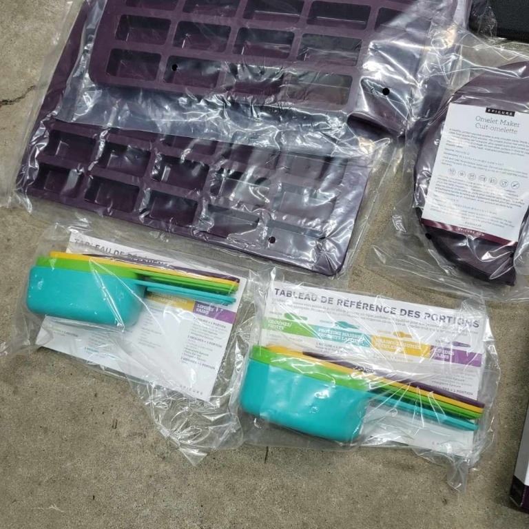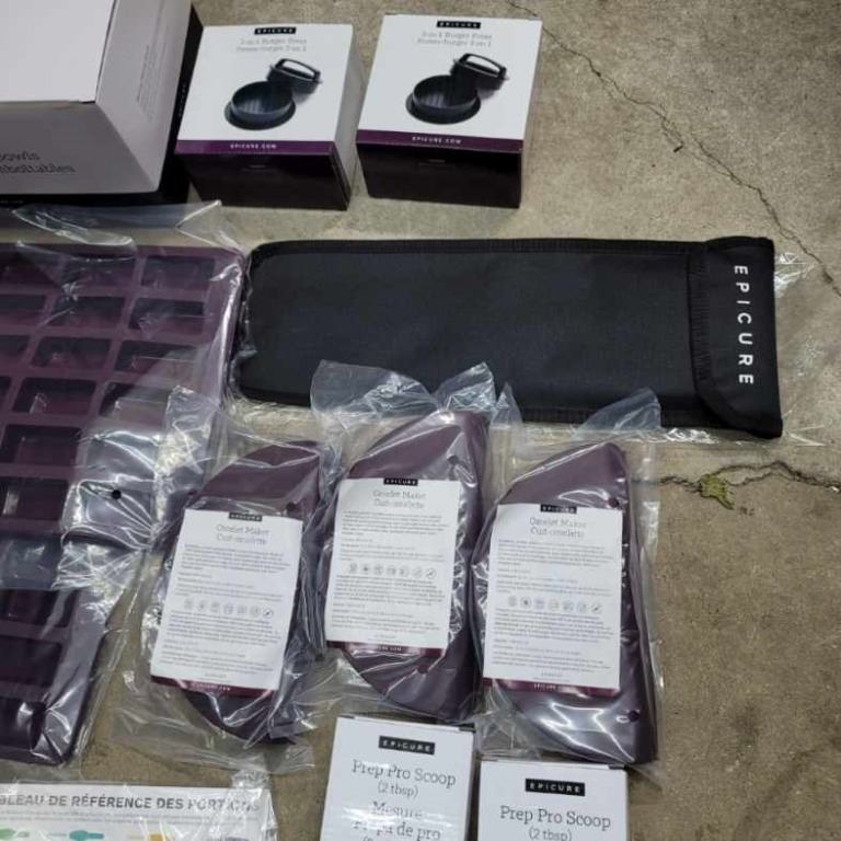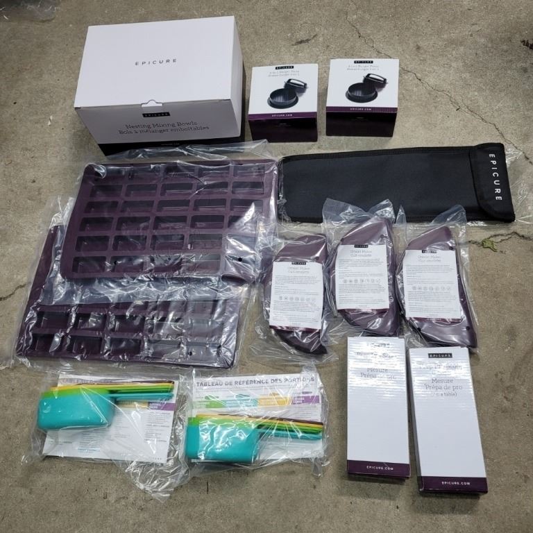 LOT OF NEW EPICURE COOKING SUPPLIES SET OF THREE NESTING MIXING BOWLS, TWO BURGER PRESSES THREE-IN-1, TWO SILICONE PORTION COOKING MOLDS, GRILL BOSS STAINLESS SKEWERS, TWO SETS OF PORTION SCOOPS, THREE OMELETTE MAKERS, AND TWO PREP PRO SCOOPS