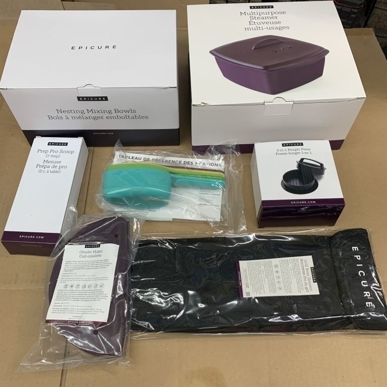 LOT OF NEW EPICURE COOKING SUPPLY LOT MULTIPURPOSE STEAMER, NESTING MIXING BOWLS, STAINLESS KABOB SKEWERS, PORTION SCOOPS, OMLETTE MAKER, PETITE SILICONE COOK TRAY, MELON BALL SCOOP AND BURGER PRESS
