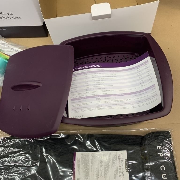 LOT OF NEW EPICURE COOKING SUPPLY LOT MULTIPURPOSE STEAMER, NESTING MIXING BOWLS, STAINLESS KABOB SK