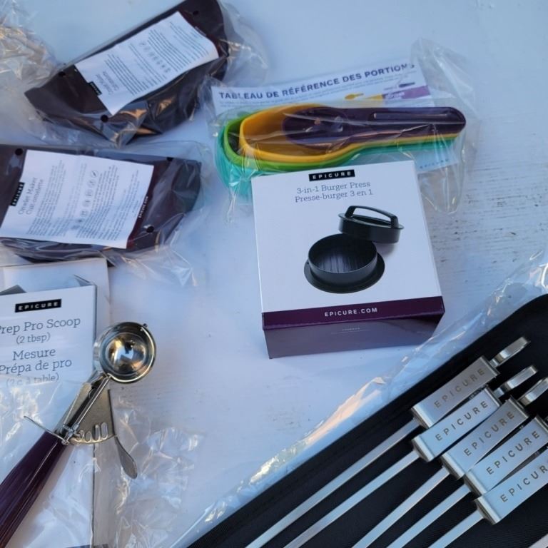 LOT OF NEW EPICURE COOKING SUPPLY LOT NESTING MIXING BOWLS, STAINLESS KABOB SKEWERS, PORTION SCOOPS, OMLETTE MAKER, PETITE SILICONE COOK TRAYMELON BALL SCOOP AND BURGER PRESS