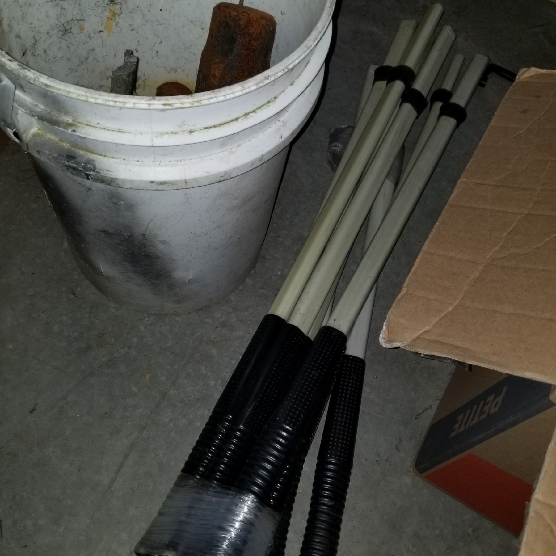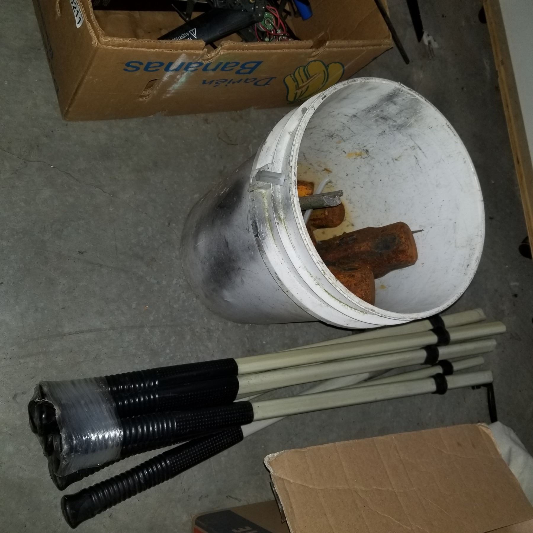 LOT OF NEW FIBERGLASS SLEDGE HANDLES AND BUCKET OF SLEDGE HAMMER HEADS