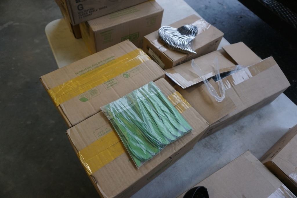 LOT OF NEW GREEN PLASTIC COMPOSTIBLE KNIVES, SILVER LOOK CURLY SPOONS AND CLEAR PLASTIC TONGS
