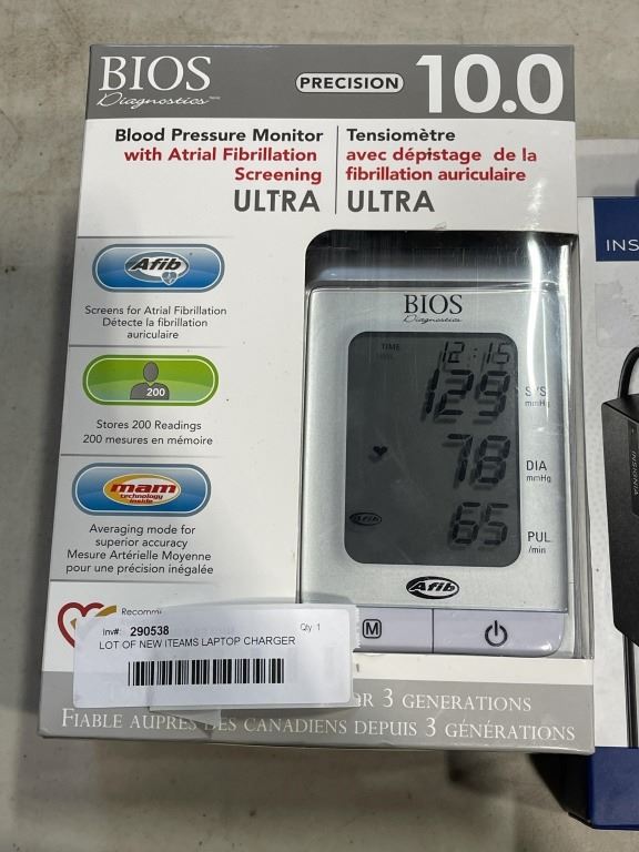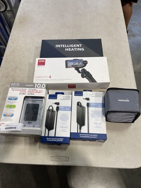 LOT OF NEW ITEMS INCLUDING ZHIYUN GIMBAL, 2 LAPTOP CHARGER AND BIOS BLOOD PRESSURE MONITOR, HEATED G