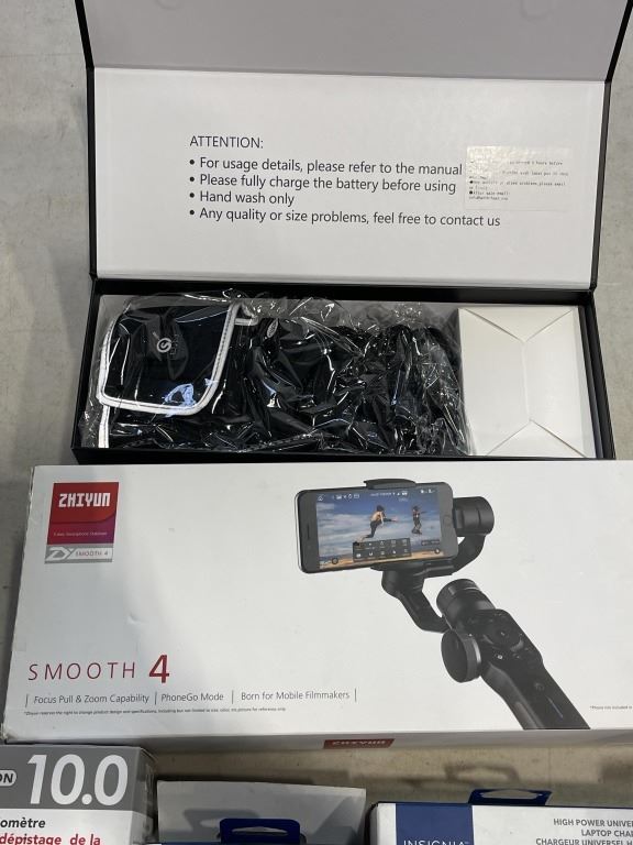 LOT OF NEW ITEMS INCLUDING ZHIYUN GIMBAL, 2 LAPTOP CHARGER AND BIOS BLOOD PRESSURE MONITOR, HEATED GLOVES ETC