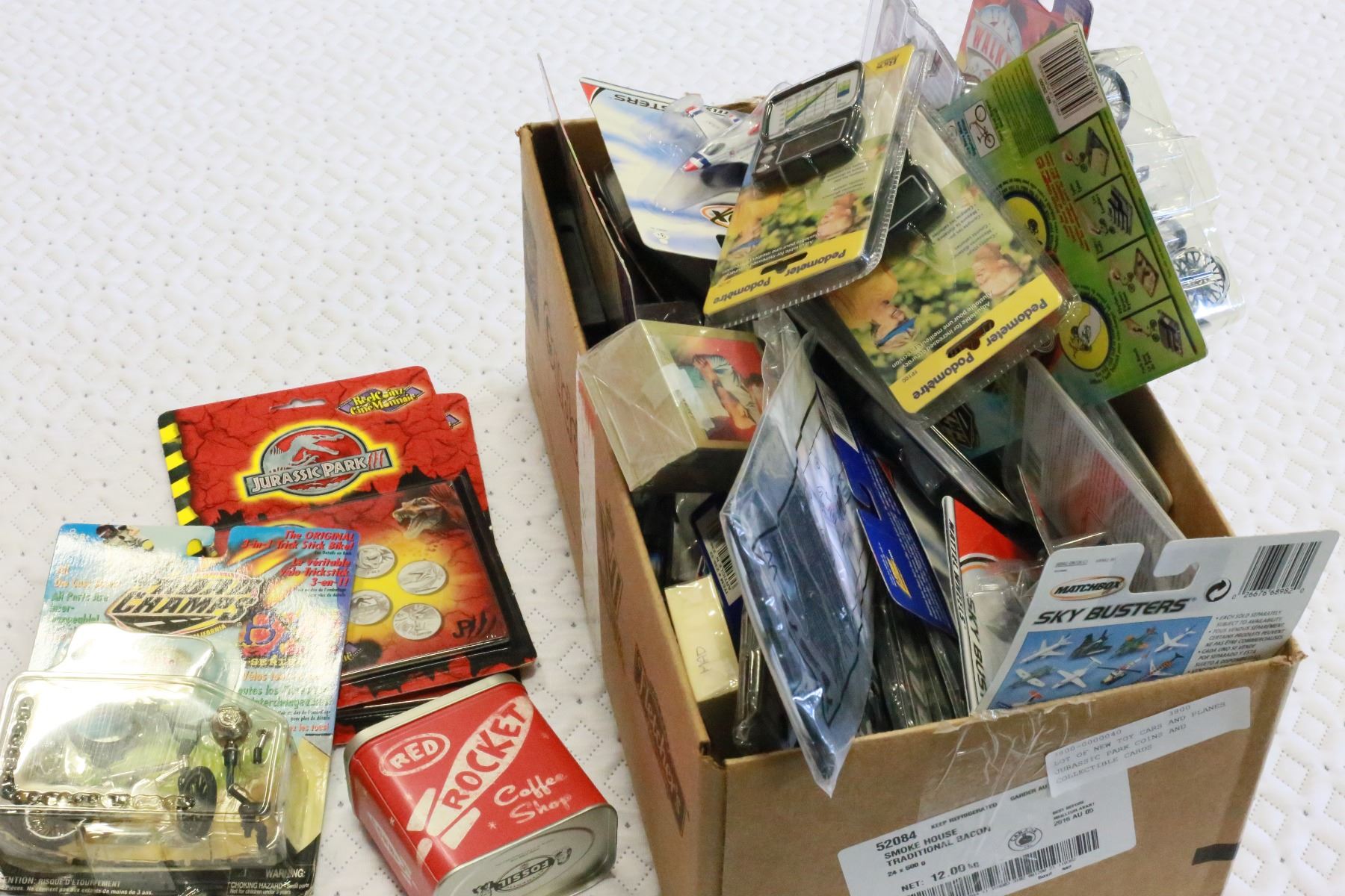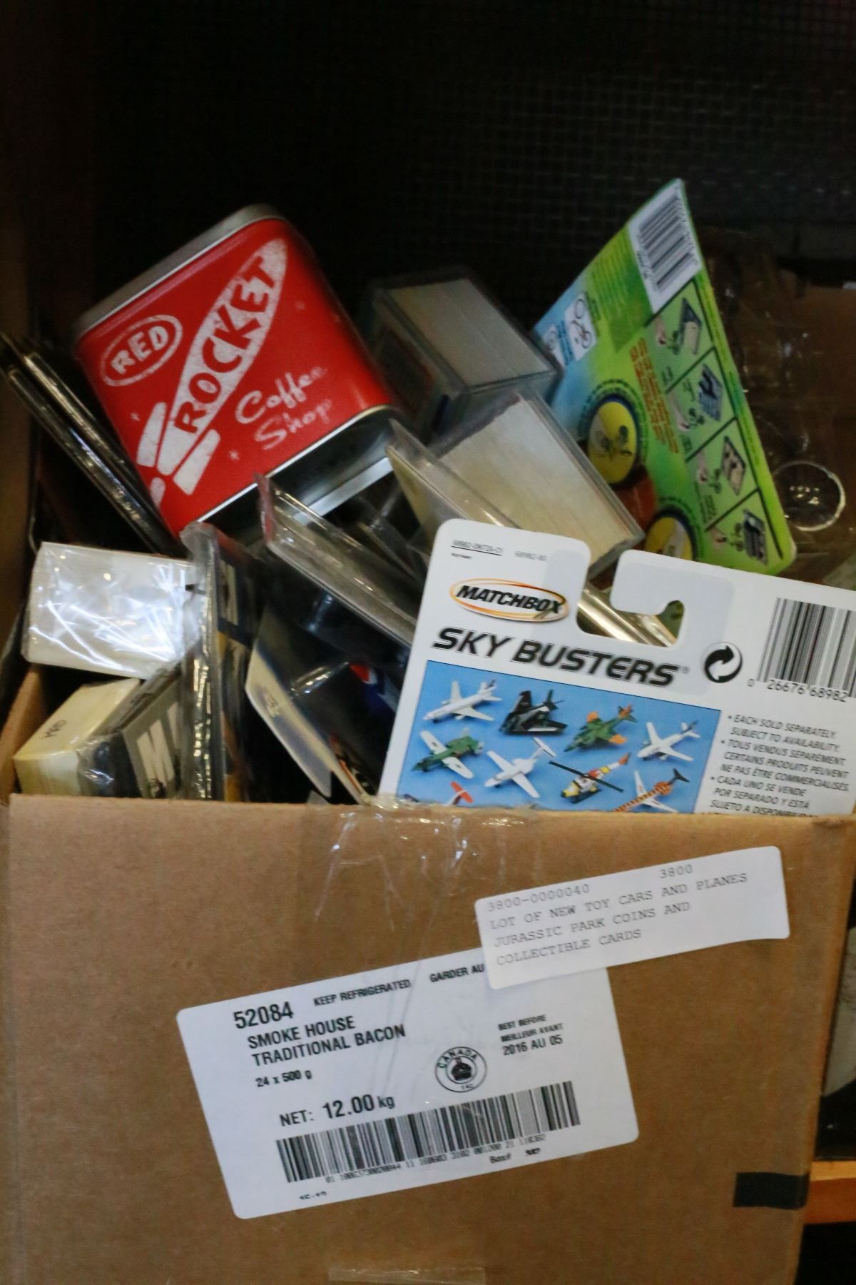 LOT OF NEW TOY CARS AND PLANES JURASSIC PARK COINS AND COLLECTIBLE CARDS