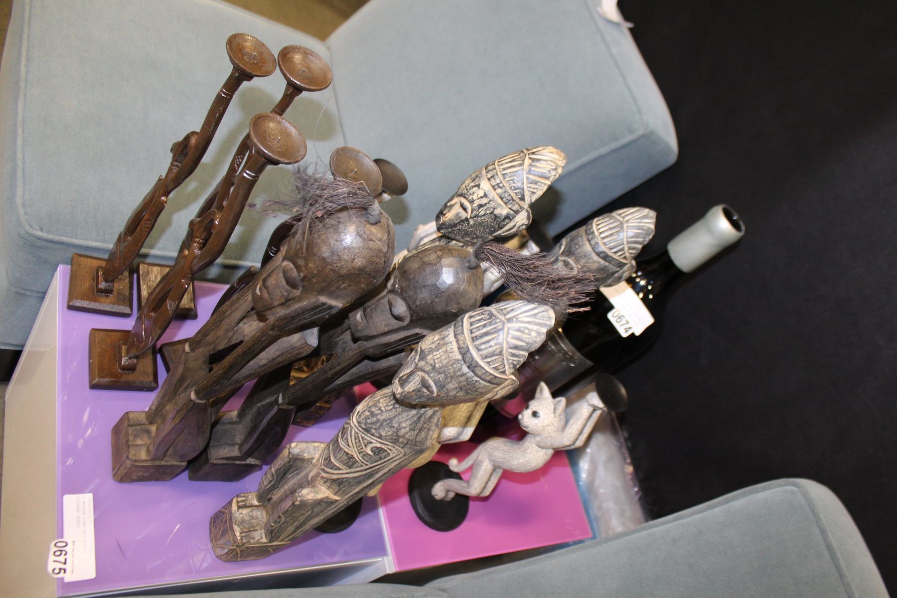 LOT OF NEW WOOD CARVINGS, STATUES AND LARGE WINE BOTTLE