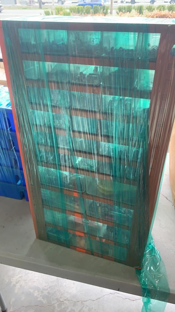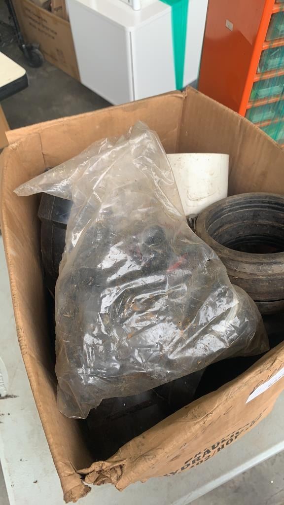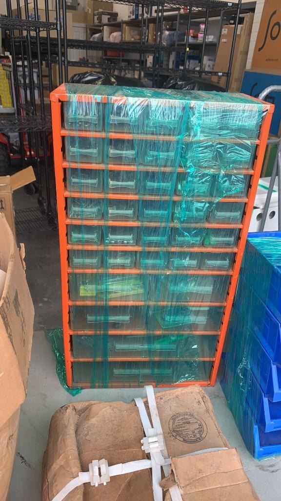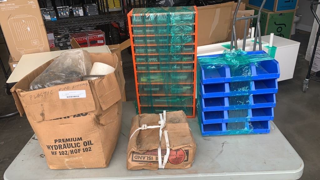 LOT OF PARTS ORGANIZER WITH CONTENTS, PARTS BINS, NAILS AND PVC CONNECTORS