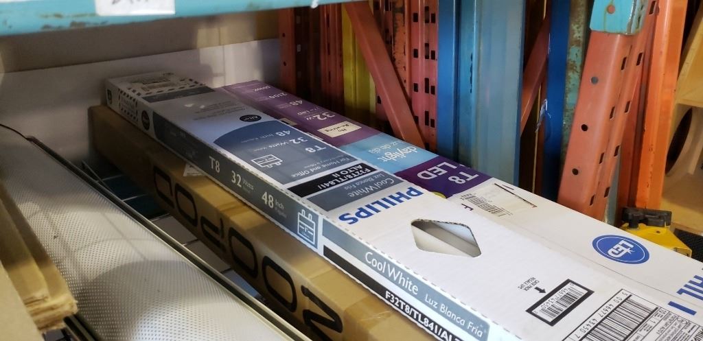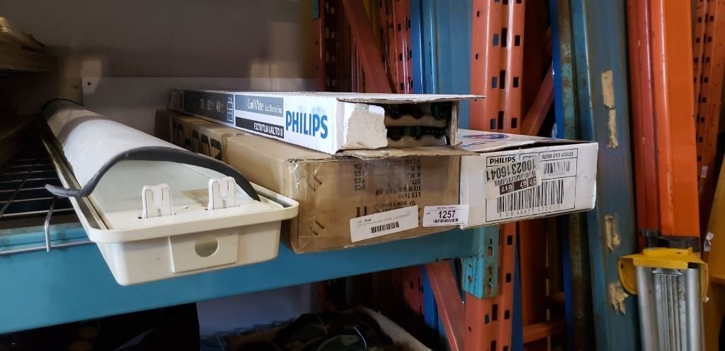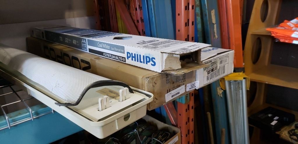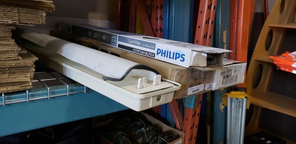 LOT OF PHILIPS AND OTHER FLUORESCENT BULBS AND LIGHT FIXTURE