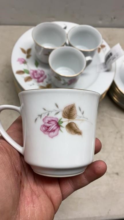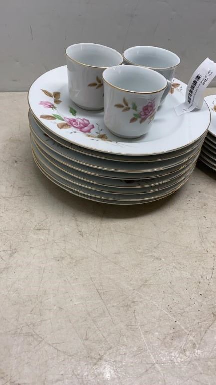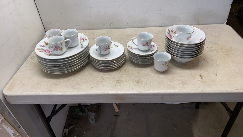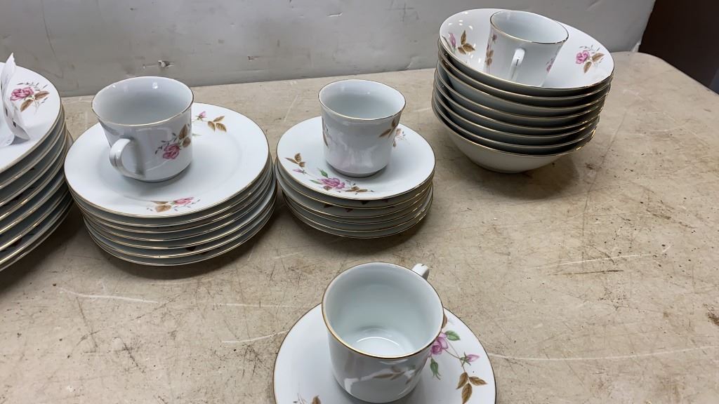 LOT OF PINK AND WHITE CHINA DISHES - 38 PIECES INCLUDES PLATES, BOWLS, CUPS, SAUCERS