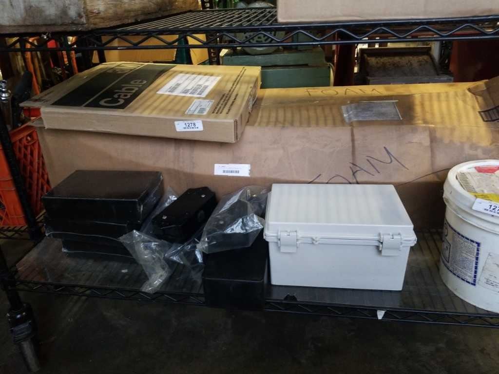 LOT OF PLASTIC JUNCTION BOXES, ROLL OF ELECTRICAL CABLE AND BOX OF FOAM