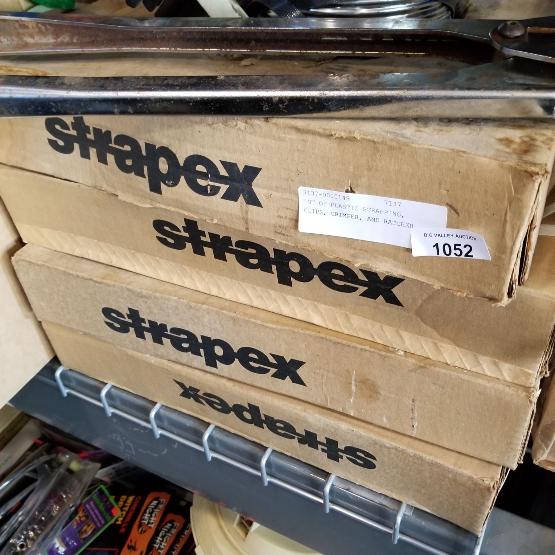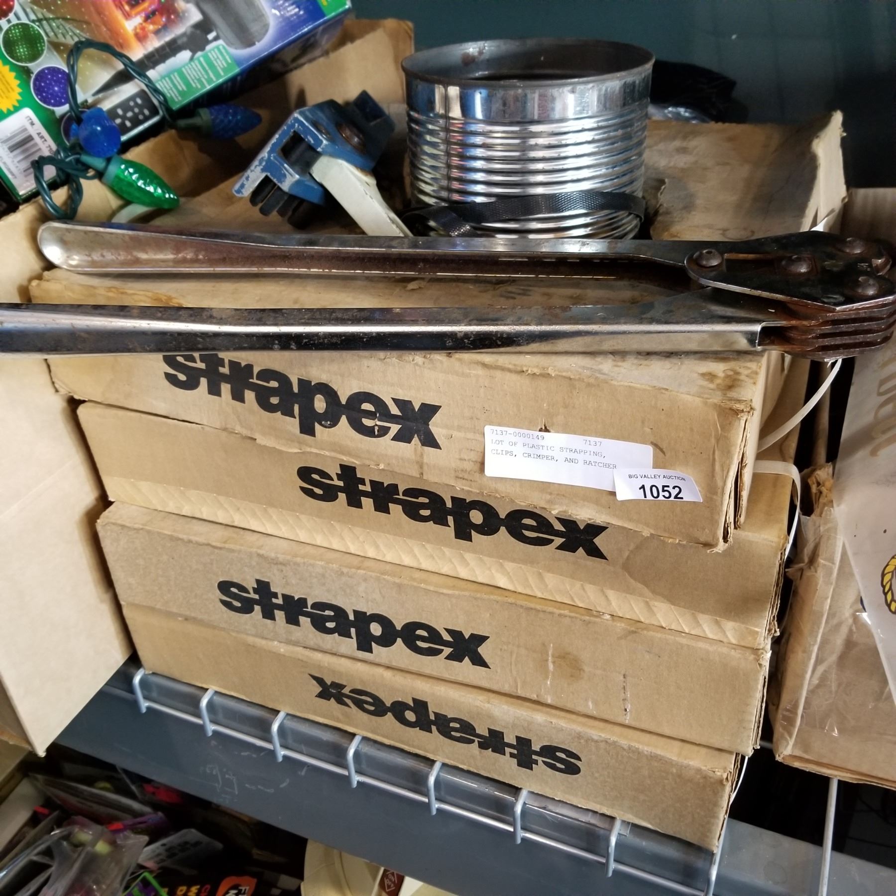 LOT OF PLASTIC STRAPPING, CLIPS, CRIMPER, AND RATCHER
