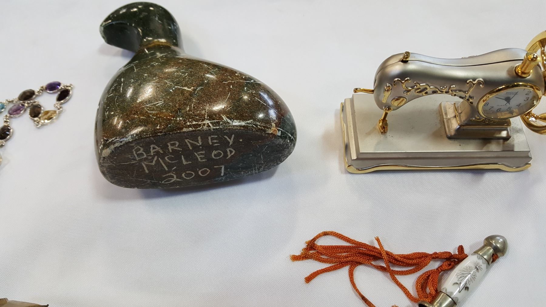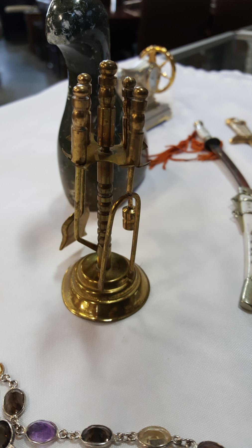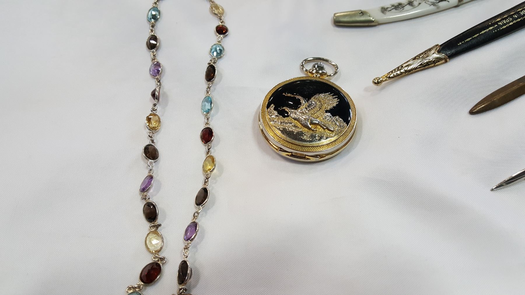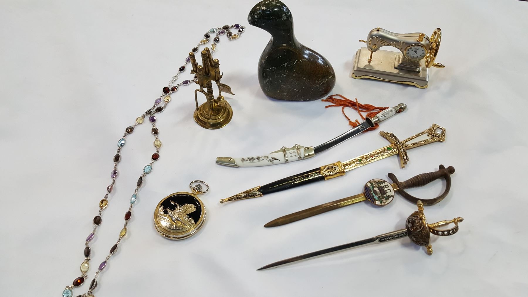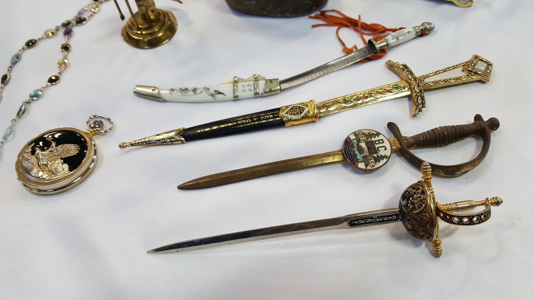 LOT OF POCKET WATCH MINI SWORDS, COMPANION SET AND SEWING CLOCK W/ NECKLACE