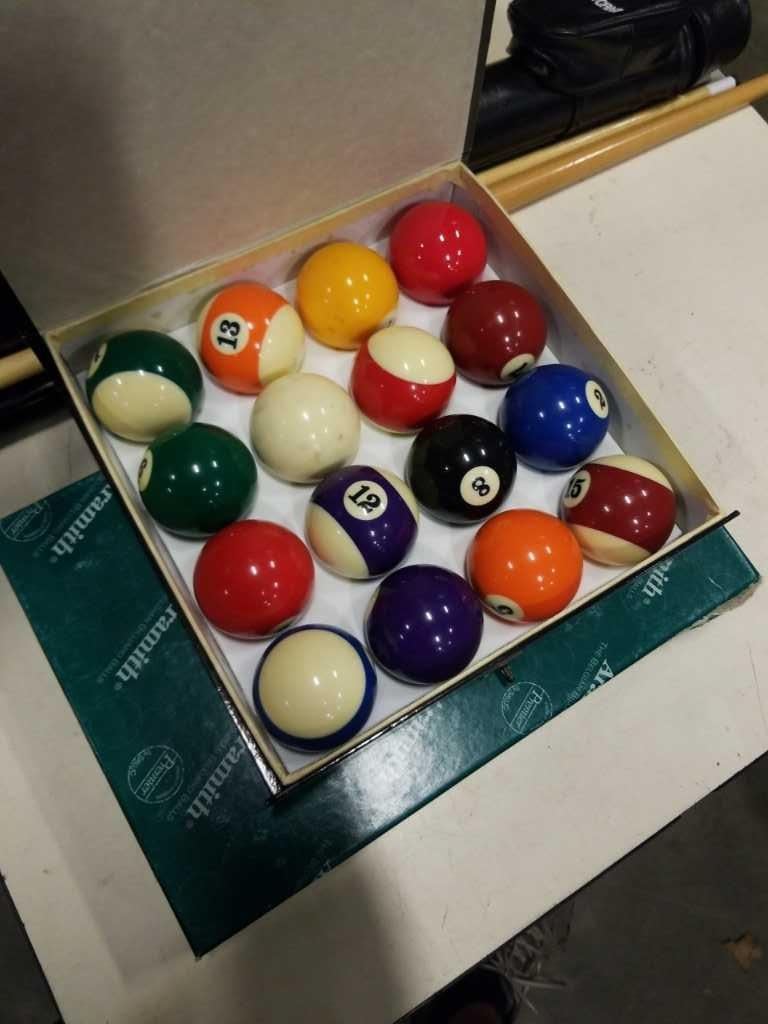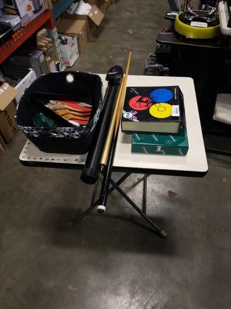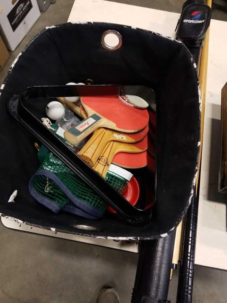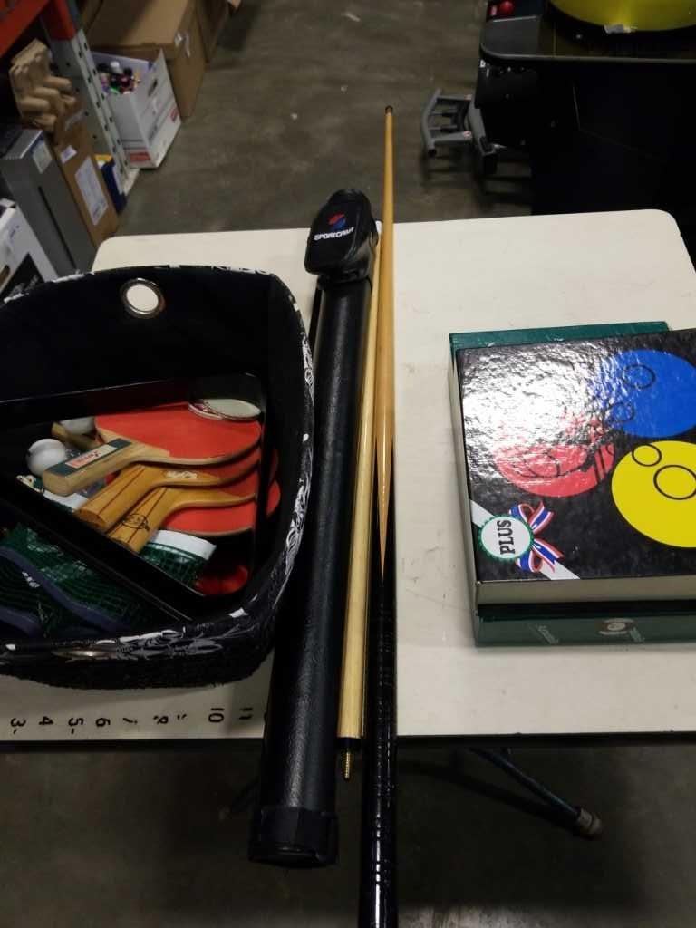 LOT OF POOL BALLS, POOL CUES, POOL ACCESSORIES, TABLE TENNIS PADDLES