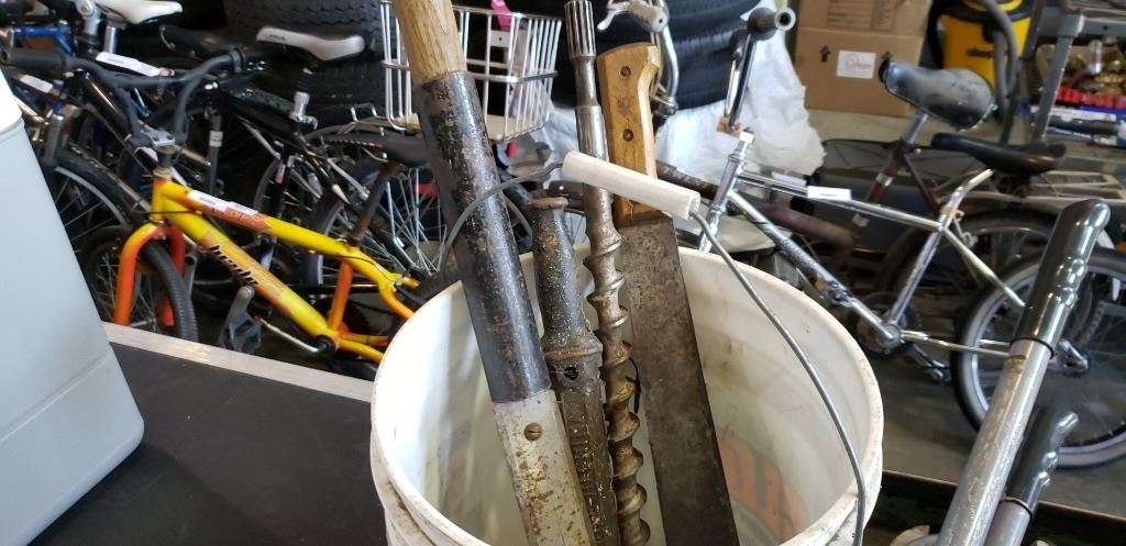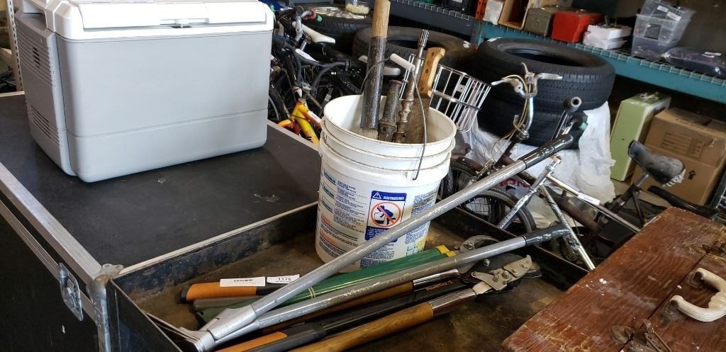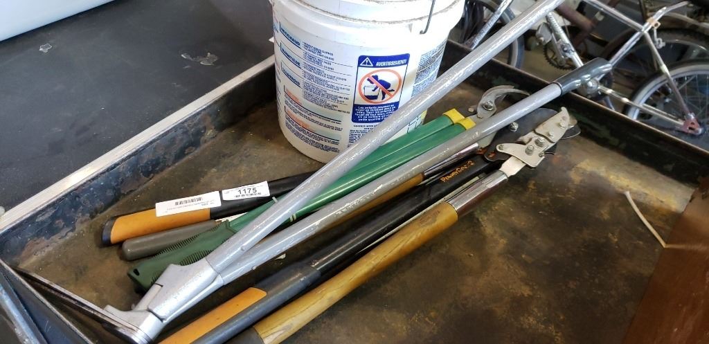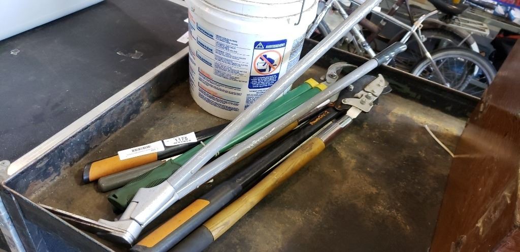 LOT OF PRUNERS, FISKARS AND OTHERS AND PAIL OF MACHETES AND TOOLS